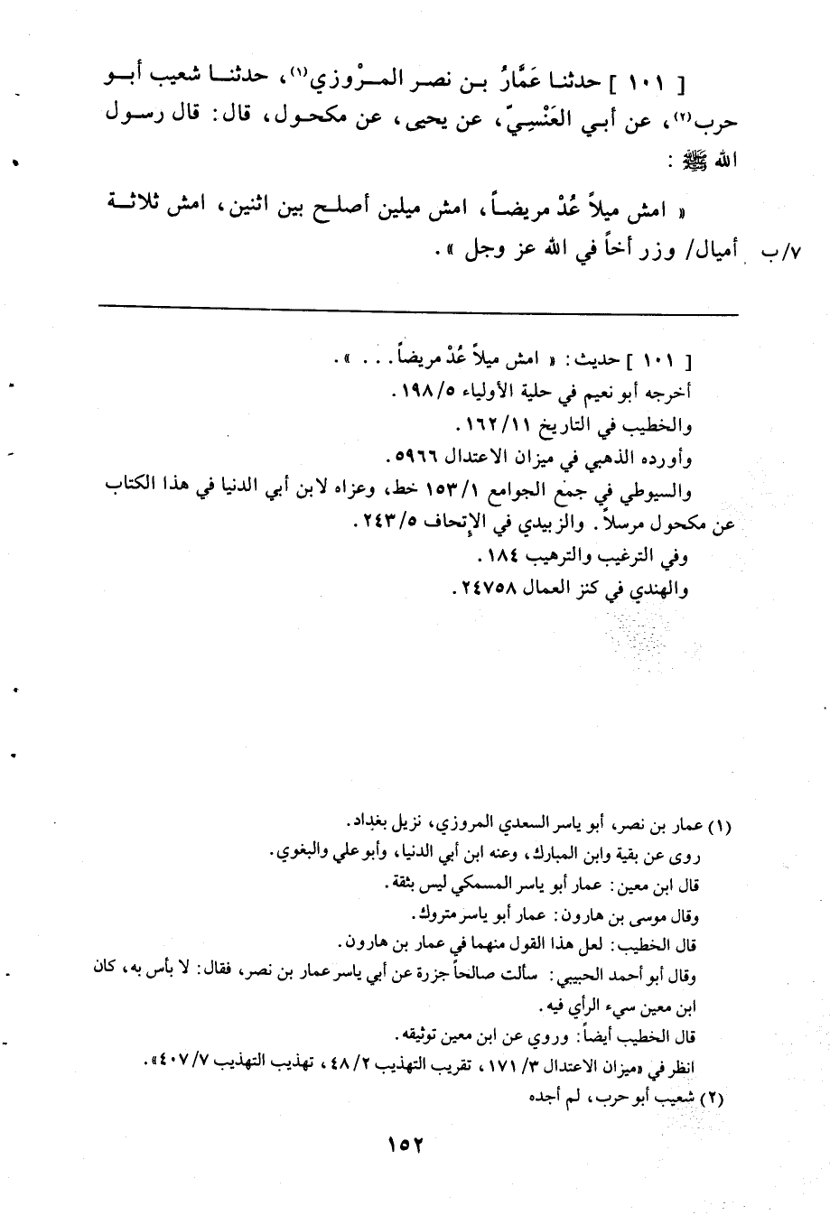 101 - حَدَّثَنَا عَمَّارُ بْنُ نَصْرِ الْمَرْوَزِيُّ، حَدَّثَنَا شُعَيْبُ أَبُو حَرْبٍ، عَنْ أَبِي عُتْبَةَ الْعَنْسِيِّ، عَنْ يَحْيَى، عَنْ مَكْحُولٍ، قَالَ: قَالَ رَسُولُ اللَّهِ صَلَّى اللهُ عَلَيْهِ وَسَلَّمَ: «امْشِ مِيلًا عُدْ مَرِيضًا، امْشِ مِيلَيْنِ أَصْلِحْ بَيْنَ اثْنَيْنِ، امْشِ ثَلَاثَةَ أَمْيَالٍ §وَزُرْ أَخًا فِي اللَّهِ عَزَّ وَجَلَّ»