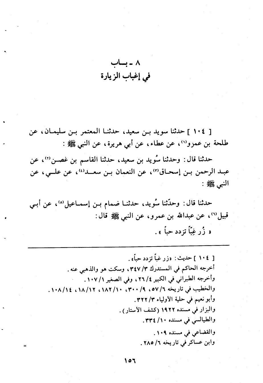 104 - حَدَّثَنَا سُوَيْدُ بْنُ سَعِيدٍ، حَدَّثَنَا الْمُعْتَمِرُ بْنُ سُلَيْمَانَ، عَنْ طَلْحَةَ بْنِ عَمْرٍو، عَنْ عَطَاءٍ، عَنْ أَبِي هُرَيْرَةَ، عَنِ النَّبِيَّ صَلَّى اللهُ عَلَيْهِ وَسَلَّمَ حَدَّثَنَا قَالَ: وَحَدَّثَنَا سُوَيْدُ بْنُ سَعِيدٍ، حَدَّثَنَا الْقَاسِمُ بْنُ غُصْنٍ، عَنْ عَبْدِ الرَّحْمَنِ بْنِ إِسْحَاقَ، عَنِ النُّعْمَانِ بْنِ سَعْدٍ، عَنْ عَلِيٍّ، عَنِ النَّبِيَّ صَلَّى اللهُ عَلَيْهِ وَسَلَّمَ حَدَّثَنَا قَالَ: وَحَدَّثَنَا سُوَيْدٌ، حَدَّثَنَا ضِمَامُ بْنُ إِسْمَاعِيلَ، عَنْ أَبِي قَبِيلٍ، عَنْ عَبْدِ اللَّهِ بْنِ عَمْرٍو، عَنِ النَّبِيَّ صَلَّى اللهُ عَلَيْهِ وَسَلَّمَ قَالَ: «§زُرْ غِبًّا تَزْدَدْ حُبًّا»