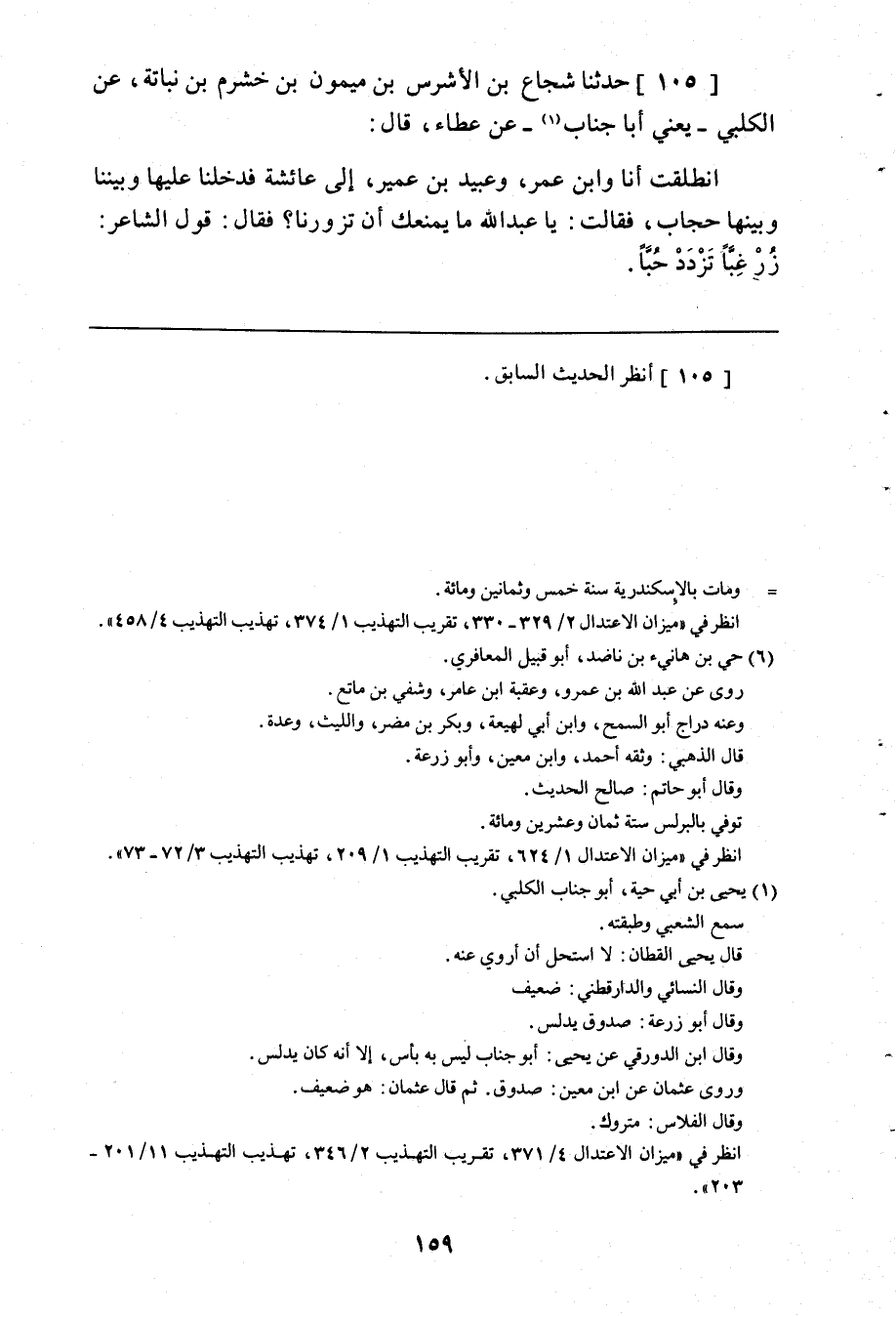 105 - حَدَّثَنَا شُجَاعُ بْنُ الْأَشْرَسِ بْنِ مَيْمُونِ بْنِ خَشْرَمِ بْنِ نُبَاتَةَ، عَنِ الْكَلْبِيِّ يَعْنِي أَبَا جَنَابٍ، عَنْ عَطَاءٍ، قَالَ: انْطَلَقْتُ أَنَا وَابْنُ عُمَرَ وَعُبَيْدُ بْنُ عُمَيْرٍ إِلَى عَائِشَةَ فَدَخَلْنَا عَلَيْهَا وَبَيْنَنَا وَبَيْنَهَا حِجَابٌ فَقَالَتْ: " يَا عَبْدَ اللَّهِ، مَا يَمْنَعُكَ أَنْ تَزُورَنَا؟ فَقَالَ: قَوْلُ الشَّاعِرِ: §زُرْ غِبًّا تَزْدَدْ حُبًّا "