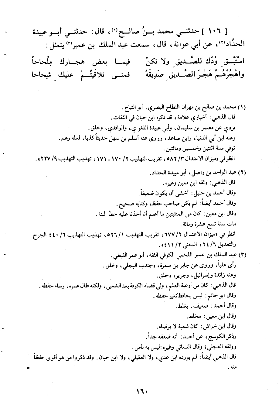 106 - حَدَّثَنِي مُحَمَّدُ بْنُ صَالِحٍ، قَالَ حَدَّثَنِي أَبُو عُبَيْدَةَ الْحَدَّادُ، عَنْ أَبِي عَوَانَةَ، قَالَ: سَمِعْتُ عَبْدَ الْمَلِكِ بْنَ عُمَيْرٍ، يَتَمَثَّلُ: