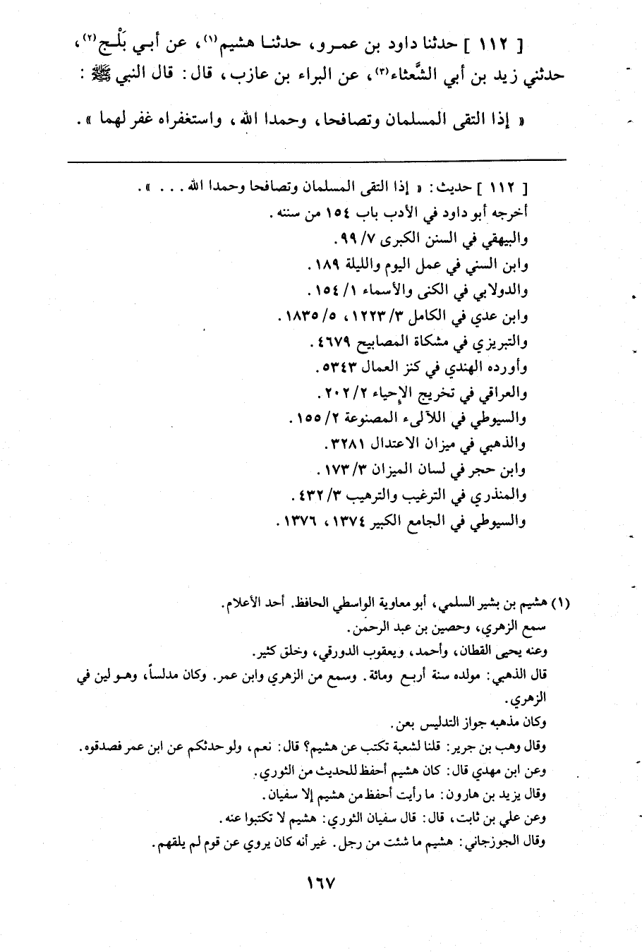 112 - حَدَّثَنَا دَاوُدُ بْنُ عَمْرٍو، حَدَّثَنَا هُشَيْمٌ، عَنْ أَبِي بَلْجٍ، حَدَّثَنِي زَيْدُ بْنُ أَبِي الشَّعْثَاءِ، عَنِ الْبَرَاءِ بْنِ عَازِبٍ، قَالَ: قَالَ النَّبِيُّ صَلَّى اللَّهُ عَلَيْهِ وَسَلَّمُ: «§إِذَا الْتَقَى الْمُسْلِمَانِ وَتَصَافَحَا وَحَمِدَا اللَّهَ وَاسْتَغْفَرَاهُ غُفِرَ لَهُمَا»