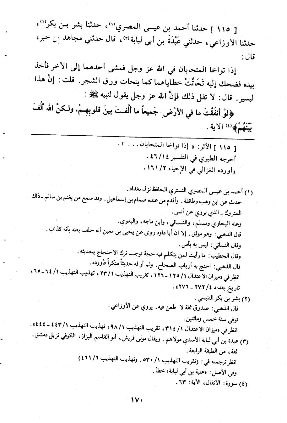 115 - حَدَّثَنَا أَحْمَدُ بْنُ عِيسَى الْمِصْرِيُّ، حَدَّثَنَا بِشْرُ بْنُ بَكْرٍ، حَدَّثَنَا الْأَوْزَاعِيُّ، حَدَّثَنِي عَبْدَةُ بْنُ أَبِي لُبَابَةَ، قَالَ: حَدَّثَنِي مُجَاهِدُ بْنُ جَبْرٍ، قَالَ: «إِذَا تَوَاخَا الْمُتَحَابَّانِ فِي اللَّهِ عَزَّ وَجَلَّ §فَمَشَى أَحَدُهُمَا إِلَى الْآخَرِ فَأَخَذَ بِيَدِهِ فَضَحِكَ إِلَيْهِ تَحَاتَّتْ خَطَايَاهُمَا كَمَا يَتَحَاتُّ وَرَقُ الشَّجَرِ» ، قُلْتُ: إِنَّ هَذَا لَيَسِيرٌ قَالَ: " لَا تَقُلْ ذَلِكَ فَإِنَّ اللَّهَ عَزَّ وَجَلَّ يَقُولُ لِنَبِيِّهِ صَلَّى اللهُ عَلَيْهِ وَسَلَّمَ {لَوْ أَنْفَقَتْ مَا فِي الْأَرْضِ جَمِيعًا مَا أَلَّفْتَ بَيْنَ قُلُوبِهِمْ وَلَكِنَّ اللَّهَ أَلَّفَ بَيْنَهُمُ} [الأنفال: 63] الْآيَةَ "
