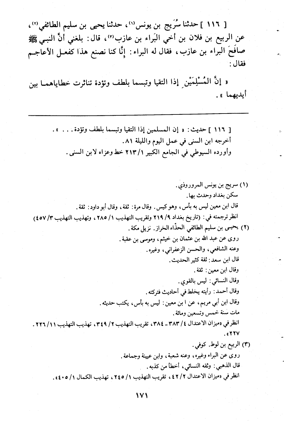 116 - حَدَّثَنَا سُرَيْجُ بْنُ يُونُسَ، حَدَّثَنَا يَحْيَى بْنُ سُلَيْمٍ الطَّائِفِيُّ، عَنِ الرَّبِيعِ بْنِ فُلَانِ ابْنُ أَخِي الْبَرَاءِ بْنِ عَازِبٍ، قَالَ: بَلَغَنِي أَنَّ النَّبِيَّ صَلَّى اللهُ عَلَيْهِ وَسَلَّمَ صَافَحَ الْبَرَاءَ بْنَ عَازِبٍ فَقَالَ لَهُ الْبَرَاءُ: إِنَّا كُنَّا نَصْنَعُ هَذَا كَفِعْلِ الْأَعَاجِمِ فَقَالَ: «إِنَّ §الْمُسْلِمَيْنِ إِذَا الْتَقَيَا وَتَبَسَّمَا بِلُطْفٍ وَتُؤْدَةٍ تَنَاثَرَتْ خَطَايَاهُمَا بَيْنَ أَيْدِيهِمَا»
