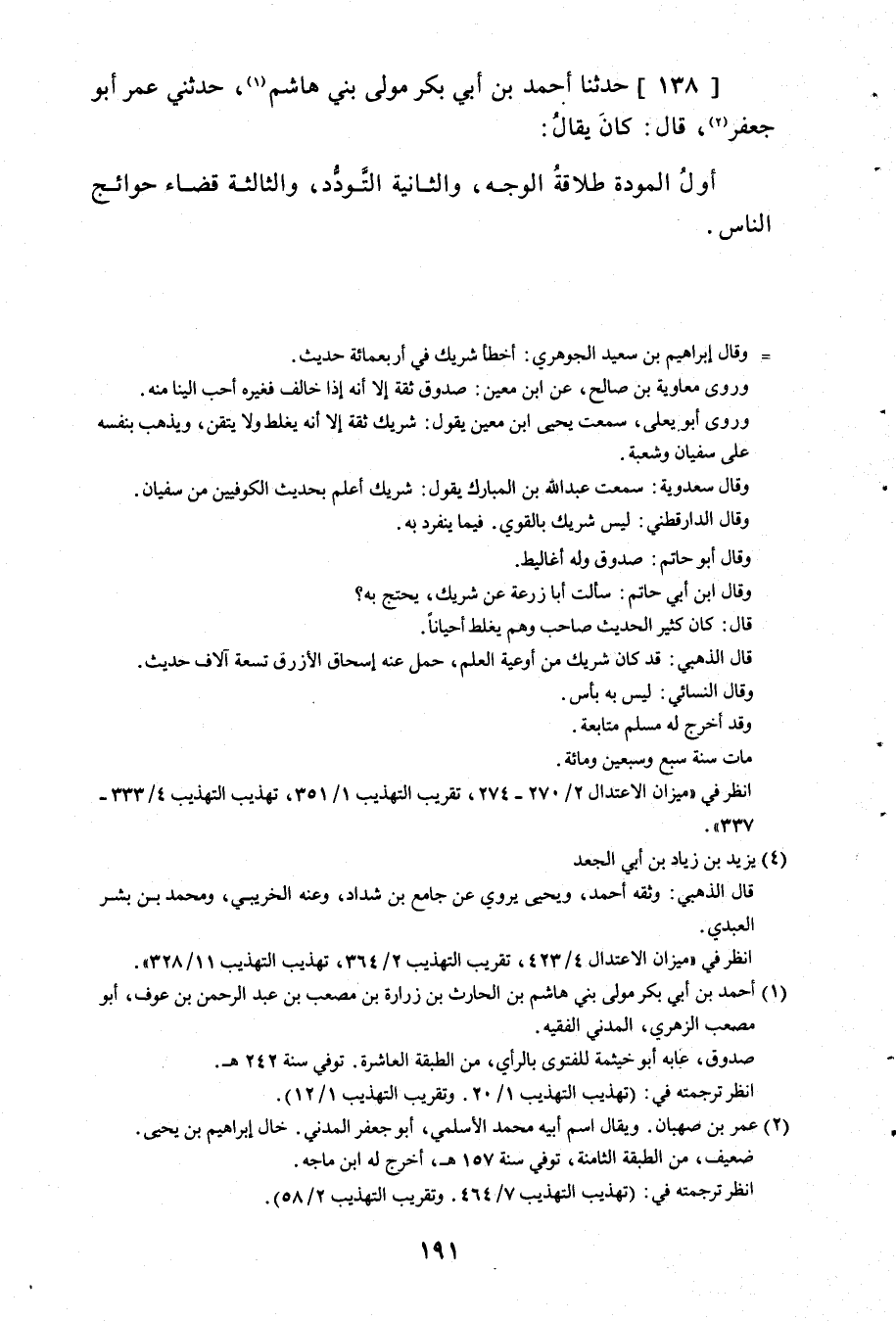138 - حَدَّثَنَا أَحْمَدُ بْنُ أَبِي بَكْرٍ، مَوْلَى بَنِي هَاشِمٍ، حَدَّثَنِي عُمَرُ أَبُو جَعْفَرٍ، قَالَ: كَانَ يُقَالَ: «§أَوَّلُ الْمَوَدَّةِ طَلَاقَةُ الْوَجْهِ وَالثَّانِيَةُ التَّوَدُّدُ وَالثَّالِثَةُ قَضَاءُ حَوَائِجِ النَّاسِ»
