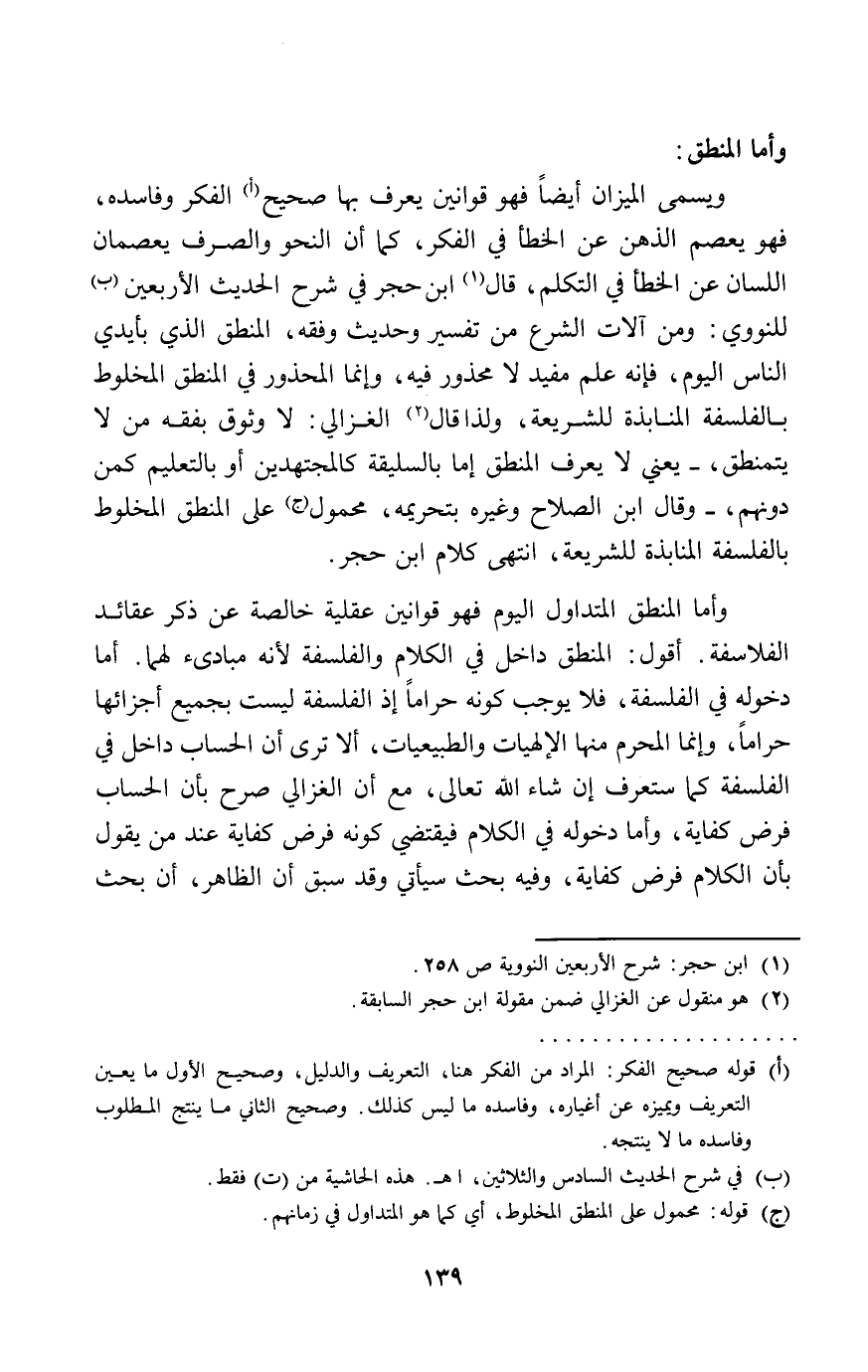 وأما المنطق المتداول اليوم فهو قوانين عقلية خالصة عن ذكر عقائد الفلاسفة. أقول: المنطق داخل في الكلام والفلسفة لأنه مبادئ لهما. أما دخوله في الفلسفة. فلا يوجب كونه حراماً إذ الفلسفة ليست بجميع أجزائها حراماً، إنما المحرم منها الإلهيات والطبيعيات، ألا ترى أن الحساب داخل في الفلسفة كما ستعرف إن شاء الله تعالى، مع أن الغزالي صرح بأن الحساب فرض كفاية، وأما دخوله في الكلام فيقتضي كونه فرض كفاية عند من يقول بأن الكلام فرض كفاية، وفيه بحث سيأتي وقد سبق أن الظاهر، أن بحث