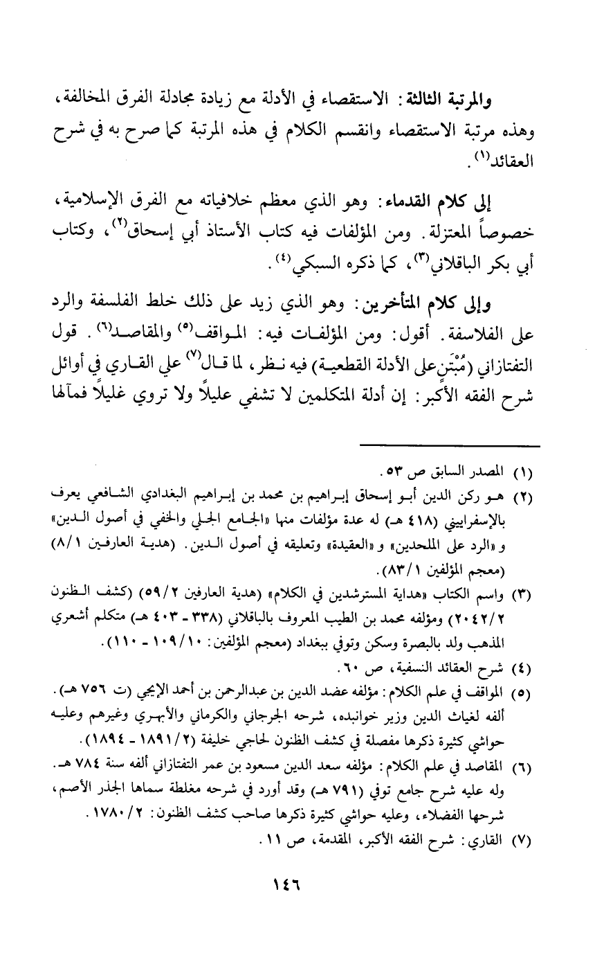 وإلى كلام المتأخرين: وهو الذي زيد على ذلك خلط الفلسفة والرد على الفلاسفة. أقول: ومن المؤلفات فيه: المواقف والمقاصد قول التفتازاني (مبتن على الأدلة القطعية) فيه نظر، لما قال على القاري في أوائل شرح الفقه الأكبر: إن أدلة المتكلمين لا تشفى عليلا ولا تروي غليلا فمآلها