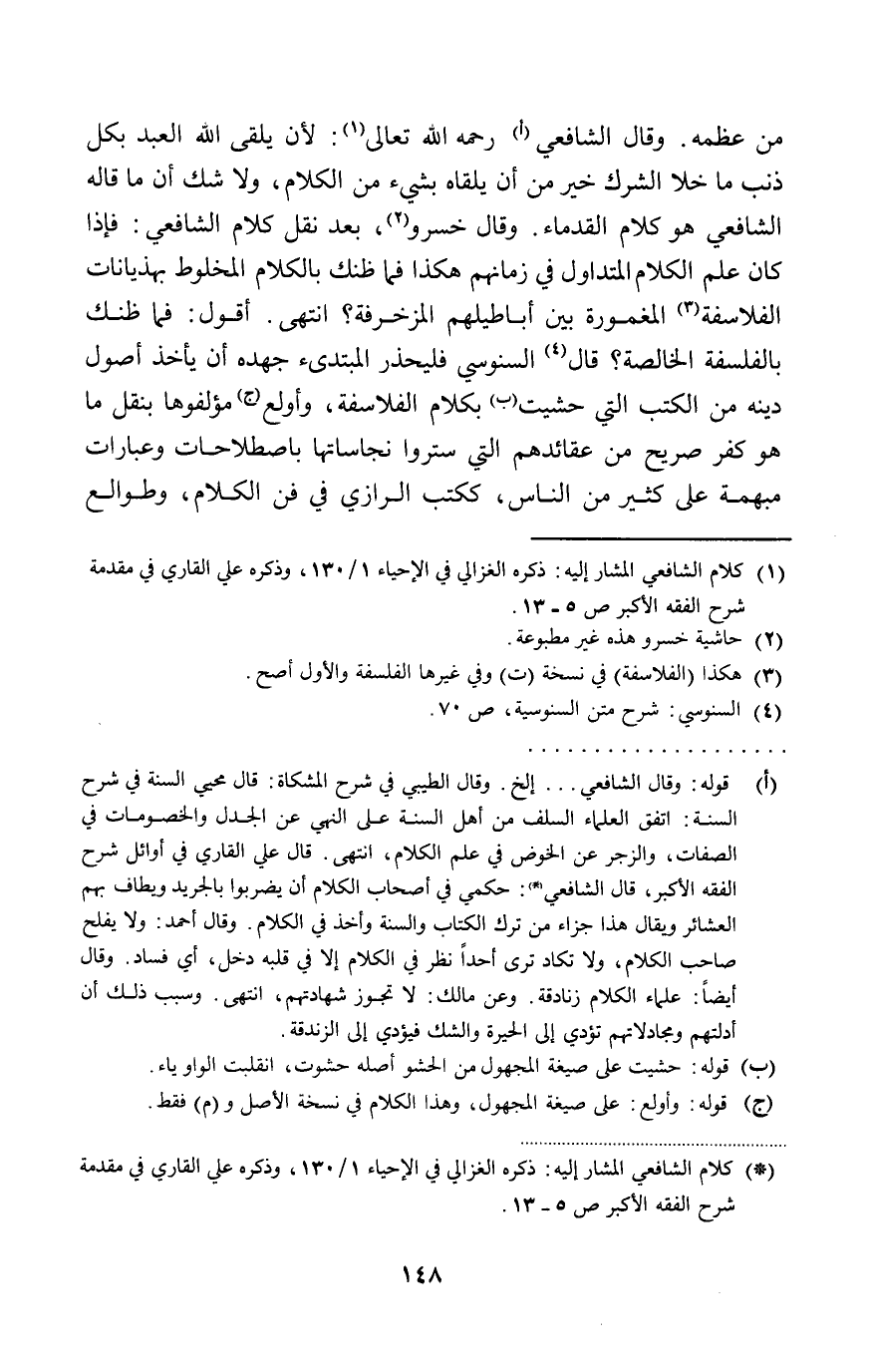 من عظمه. وقال الشافعي رحمه الله تعالى: لأن يلقي الله العبد بكل ذنب ما خلا الشرك خير من أن يلقاه بشيء من الكلام، ولا شك أن ما قاله الشافعي هو كلام القدماء. وقال خسرو، بعد نقل كلام الشافعي: فإذا كان علم الكلام المتداول في زمانهم هكذا فما ظنك بالكلام المخلوط بهذيانات الفلاسفة المغمورة بين أباطيلهم المزخرفة؟ انتهى. أقول: فما ظنك بالفلسفة الخالصة؟ قال السنوسي فليحذر المبتدئ جهده أن يأخذ أصول دينه من الكتب التي حشيت بكلام الفلاسفة، وأولع مؤلفوها بنقل ما هو كفر صريح من عقائدهم التي ستروا نجاساتها باصطلاحات وعبارات مبهمة على كثير من الناس، ككتب الرازي في فن الكلام، وطوالع