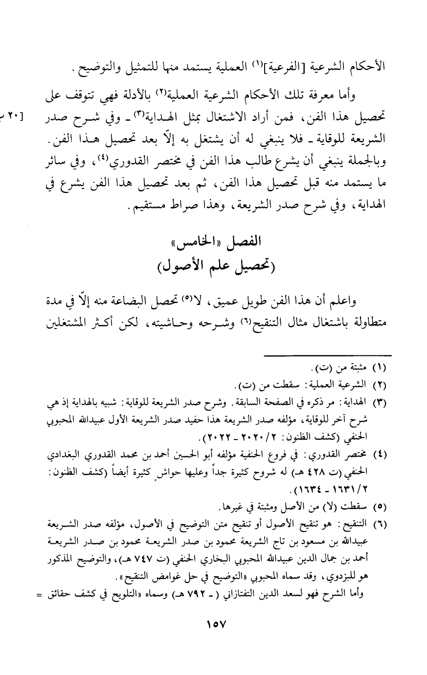 وأما معرفة تلك الأحكام الشرعية العملية بالأدلة فهي تتوقف على تحصيل هذا الفن، فمن أراد الاشتغال بمثل الهداية- وفي شرح صدر الشريعة للوقاية- فلا ينبغي له أن يشتغل به إلا بعد تحصيل هذا الفن.