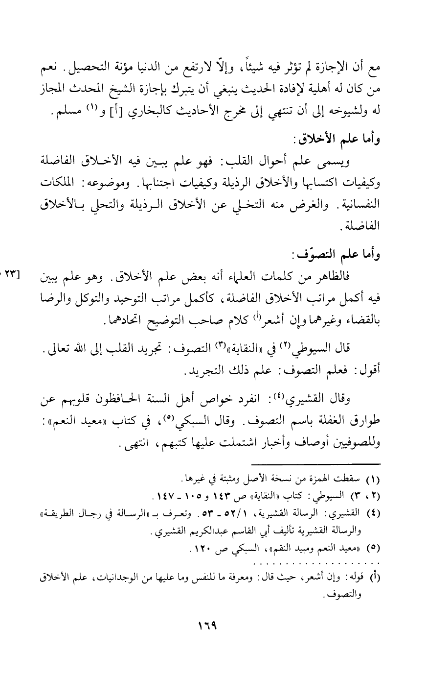 وقال القشيري: انفرد خواص أهل السنة الحافظون قلوبهم عن طوارق الغفلة باسم التصوف. وقال السبكي، في كتاب "معبد النعم": وللصوفيين أوصاف وأخبار اشتملت عليها كتبهم، انتهى.