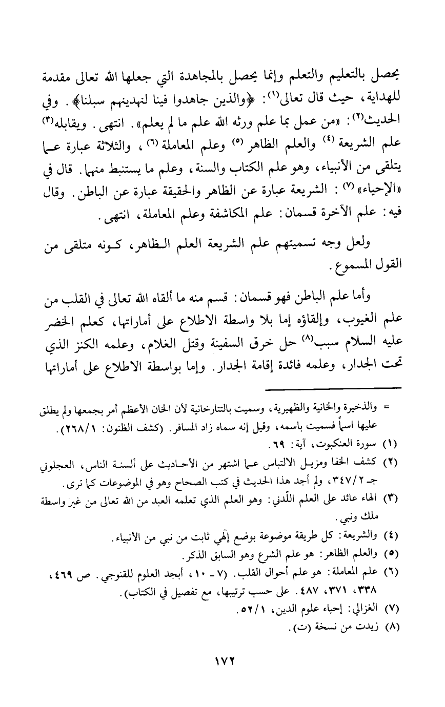 يحصل بالتعليم والتعلم وإنما يحصل بالمجاهدة التي جعلها الله تعالى مقدمة للهداية، حيث قال تعالى: {وَالَّذِينَ جَاهَدُوا فِينَا لَنَهْدِيَنَّهُمْ سُبُلَنَا}. وفي الحديث: "من عمل بما علم ما لم يعلم" انتهى. ويقابله علم الشريعة والعلم الظاهر وعلم المعاملة، والثلاثة عبارة عما يتلقى من الأنبياء، وهو علم الكتاب والسنة، وعلم ما يستنبط منهما. قال في "الإحياء": الشريعة عبارة عن الظاهر والحقيقة عبارة عن الباطن. وقال فيه: علم الآخرة قسمان: علم المكاشفة وعلم المعاملة، انتهى.