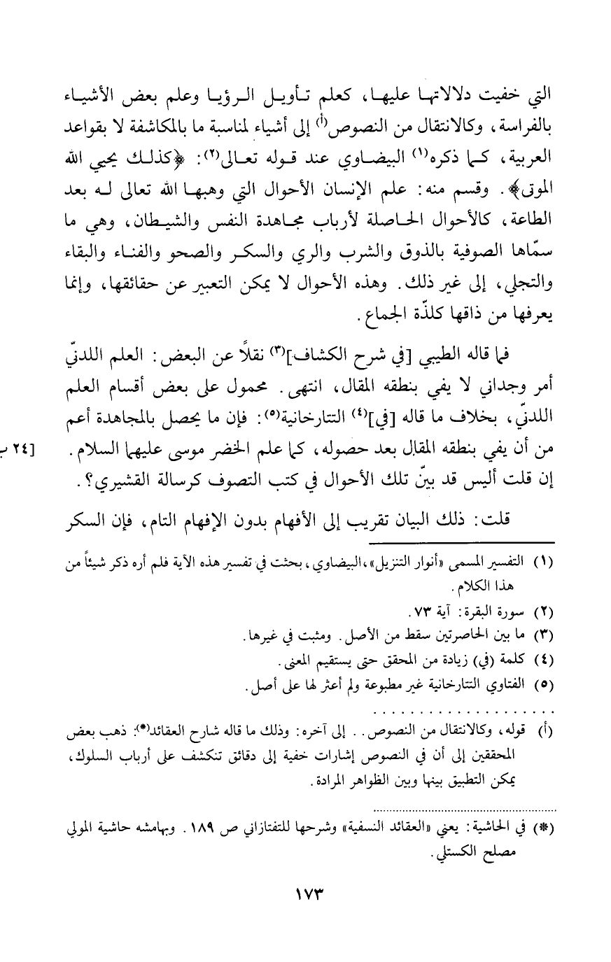 التي خفيت دلالاتها عليها، كعلم تأويل الرؤيا وعلم بعض الأشياء بالفراسة، وكالانتقال من النصوص إلى أشياء لمناسبة ما بالمكاشفة لا بقواعد العربية، كما ذكره البيضاوي عند قوله تعالى: {كَذَلِكَ يُحْيِي اللَّهُ الْمَوْتَى} وقسم منه: علم الإنسان الأحوال التي وهبها الله تعالى له بعد الطاعة، كالأحوال الحاصلة لأرباب مجاهدة النفس والشيطان، وهي ما سماها الصوفية بالذوق والشرب والري والسكر والصحو والفناء والبقاء والتجلي، إلى غير ذلك. وهذه الأحوال لا يمكن التعبير عن حقائقها، وإنما يعرفها من ذاقها كلذه الجماع.