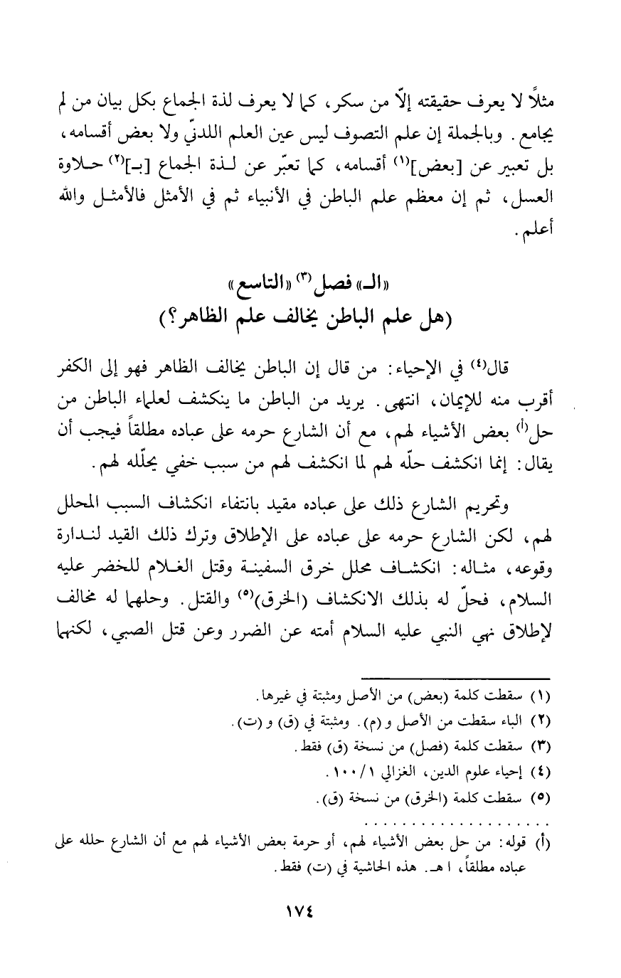 قال في الإحياء: من قال إن الباطن يخالف الظاهر فهو إلى الكفر أقرب منه للإيمان، انتهى. يريد من الباطن ما ينكشف لعلماء الباطن من حل بعض الأشياء لهم، مع أن الشارع حرمه على عباده مطلقًا فيجب أن يقال: إنما انكشف حله لهم لما انكشف لهم من سبب خفي يحلله لهم.