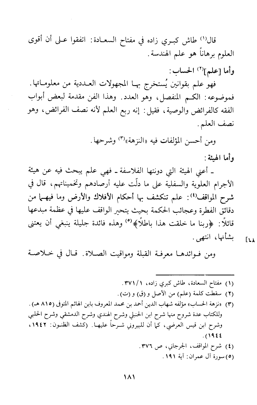 -أعني الهيئة التي دونتها الفلاسفة- فهي علم يبحث فيه عن هيئة الأجرام العلوية والسفلية على ما دلت عليه أرصادهم وتخميناتهم، قال في شرح المواقف: علم تنكشف بها أحكام الأفلاك والأرض وما فيهما من دقائق الفطرة وعجائب الحكمة بحيث يتحير الواقف عليها في عظمة مبدعها قائلاً: } رَبَّنَا مَا خَلَقْتَ هَذا بَاطِلاً {[آل عمران: 191] وهذه فائدة جليلة ينبغي أن يعتني بشأنها، انتهى.