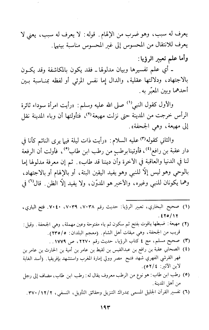 والثاني كقوله عليه السلام: «رأيت ذات ليلة فيما يرى النائم كأنا في دار عقبة بن رافع، فأوتينا برطب من رطب ابن طاب، فأولت أن الرفعة لنا في الدنيا والعاقبة في الآخرة وأن ديننا قد طاب». ثم إن معرفة مدلولها إما بالوحي وهو ليس إلا للنبي وهو يفيد اليقين البتة، أو بالإلهام أو بالاجتهاد، وهما يكونان للنبي وغيره، والأخير هو المدون، ولا يفيد إلا الظن. قال في