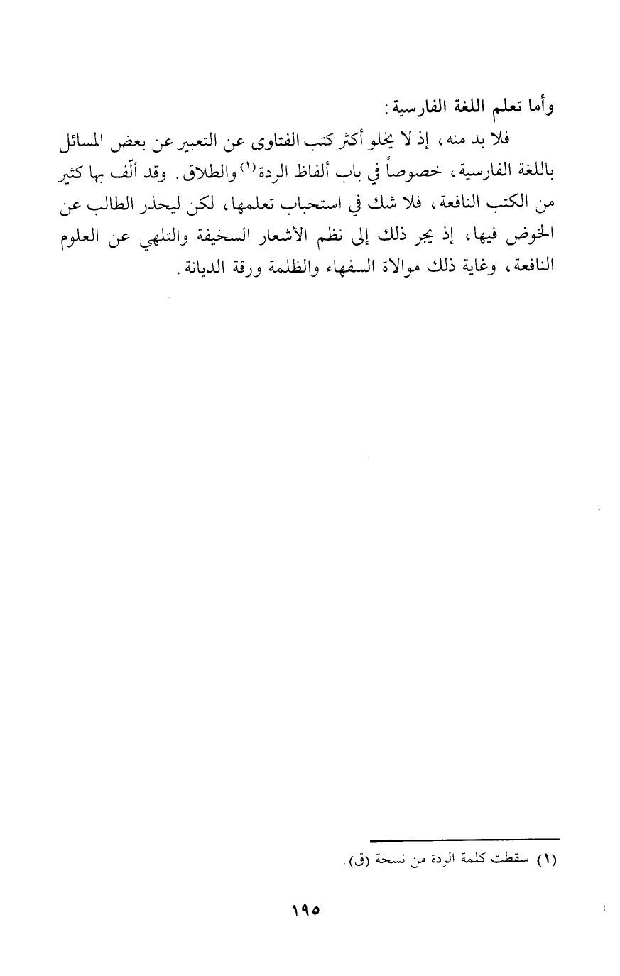 فلابد منه، إذ لا يخلو أكثر كتب الفتاوى عن التعبير عن بعض المسائل باللغة الفارسية، خصوصاً في باب ألفاظ الردة والطلاق. وقد ألف بها كثير من الكتب النافعة، فلا شك في استحباب تعلمها، لكن ليحذر الطالب عن الخوض فيها، إذ يجر ذلك إلي نظم الأشعار السخيفة والتلهي عن العلوم النافعة، وغاية ذلك موالاة السفهاء والظلمة ورقة الديانة.