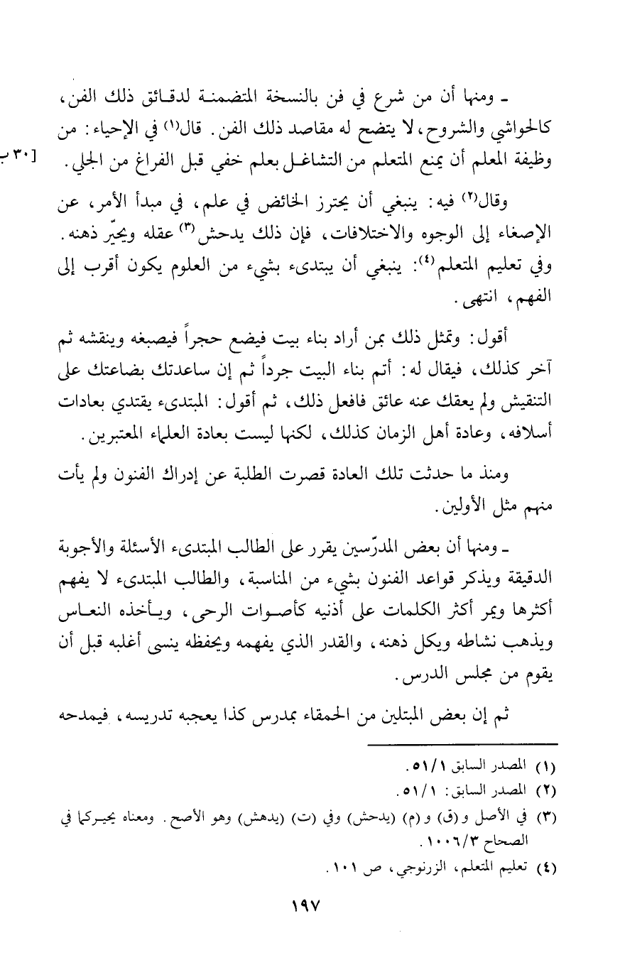 وقال فيه: ينبغي أن يحترز الخائض في علم، في مبدأ الأمر، عن الإصغاء إلي الوجوه والاختلافات، فان ذلك يدحش عقله ويحير ذهنه. وفي تعليم المتعلم: ينبغي أن يبتدئ من العلوم يكون أقرب إلي الفهم، انتهي.