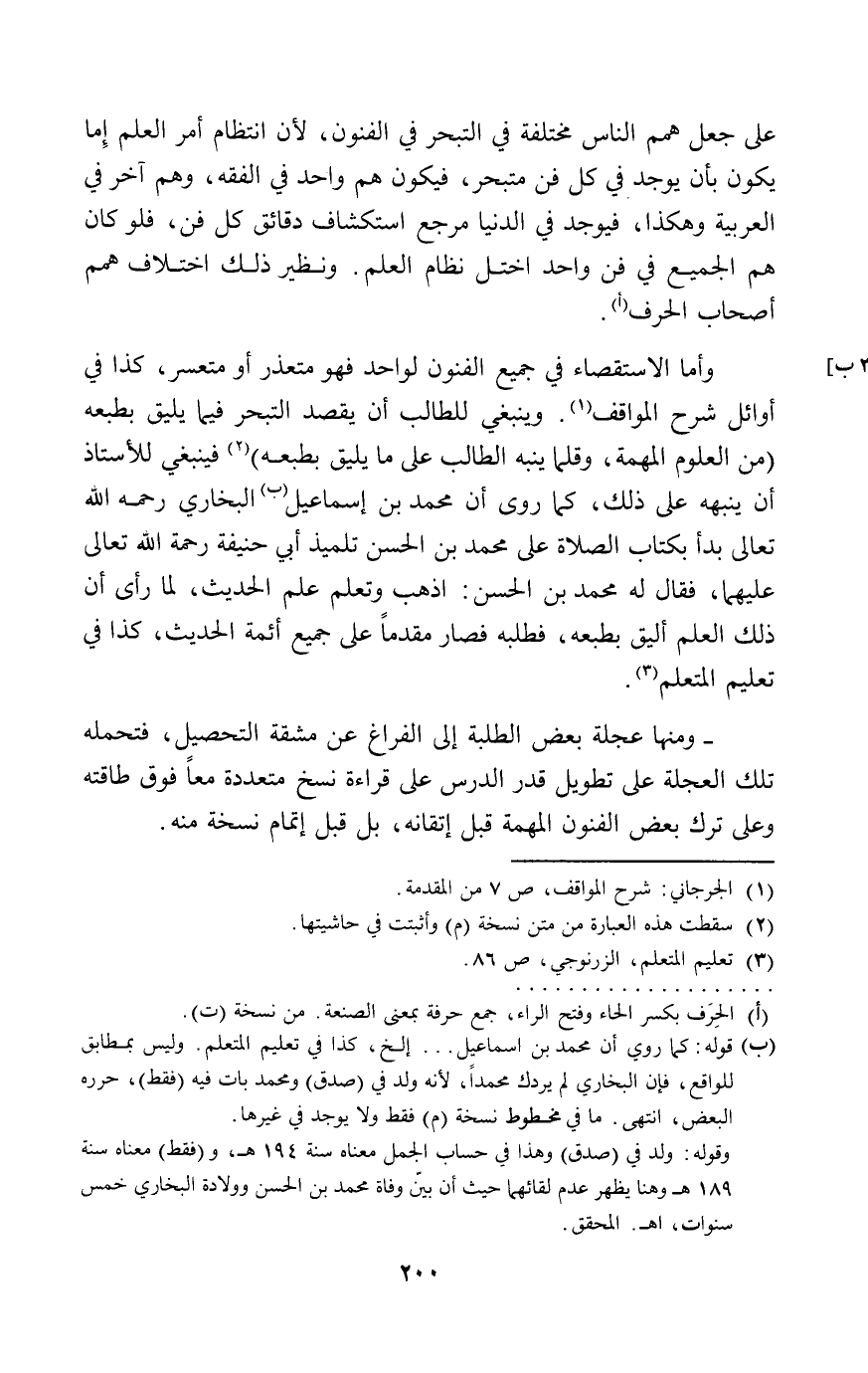 وأما الاستقصاء في جميع الفنون لواحد فهو متعذر أو متعسر، كذا في أوائل شرح المواقف. وينبغي للطالب أن يقصد التبحر فيما يليق بطبعه (من العلوم المهمة، وقلما ينبه الطالب على ما يليق بطبعه) فينبغي للأستاذ أن ينبهه على ذلك، كما روى أن محمد بن إسماعيل البخاري رحمة الله تعالى بدأ بكتاب الصلاة على محمد بن الحسن تلميذ أبي حنيفة رحمة الله تعالى عليهما، فقال له محمد بن الحسن: اذهب وتعلم علم الحديث، لما رأى أن ذلك العلم ألبق بطبعه، فطلبه فصار مقدماً على جميع أئمة الحديث، كذا في تعليم المتعلم.