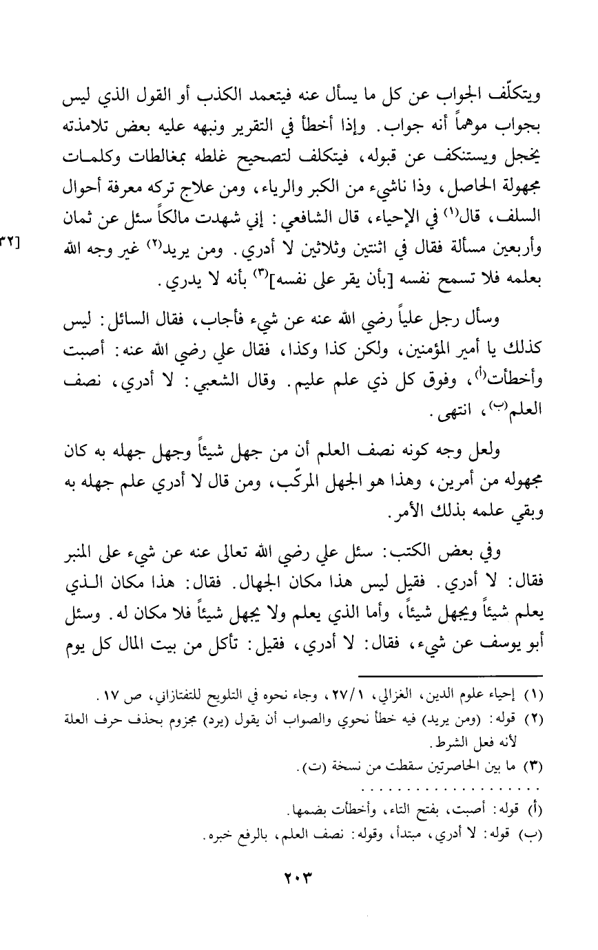 وسأل رجل علياً رضي الله عنه عن شيء فأجاب، فقال السائل: ليس كذلك يا أمير المؤمنين، ولكن كذا وكذا، وقال الشعبي: لا أدري، نصف العلم، انتهى.