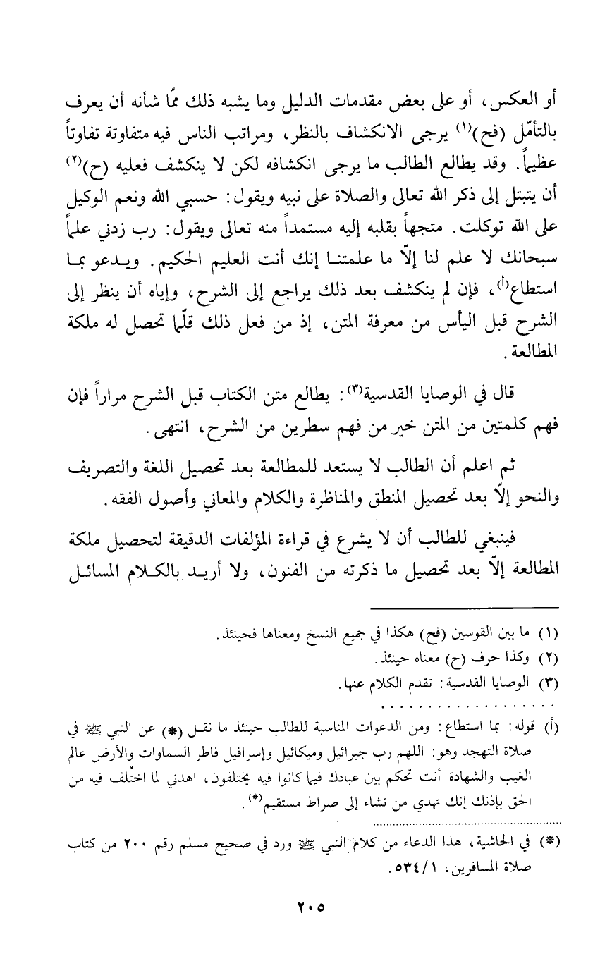 أو العكس، أو على بعض مقدمات الدليل وما يشبه ذلك مما شأنه أن يعرف بالتأمل (فح) يرجى الانكشاف بالنظر، ومراتب الناس فيه متفاوتة تفاوتاً عظيماً. وقد يطالع الطالب ما يرجي انكشافه لكن لا ينكشف فعليه (ح) أن يتبتل إلي ذكر الله تعالى والصلاة على نبيه ويقول: حسبي الله ونعم الوكيل على الله توكلت. متجهاً بقلبه إليه مستمداً منه تعالى ويقول: رب زدني علماً سبحانك لا علم لنا إلا ما علمتنا إنك أنت العليم الحكيم. ويدعو بما استطاع، فإن لم ينكشف بعد ذلك يراجع إلي الشرح، وإياه أن ينظر إلي الشرح قبل اليأس من معرفة المتن، إذ من فعل قلما تحصل له ملكة المطالعة.
