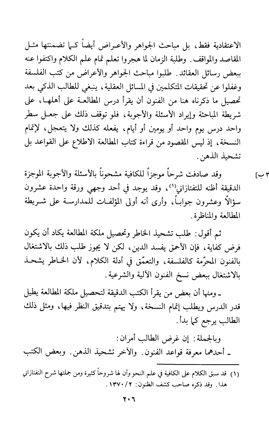 الاعتقادية فقط، بل مباحث الجواهر والأعراض أيضاً كما تضمنتها مثل المقاصد والمواقف. وطلبة الزمان لما هجروا تعلم تمام علم الكلام واكتفوا عنه ببعض رسائل العقائد. طلبوا مباحث الجواهر والأعراض من كتب الفلسفة وغفلوا عن تحقيقات المتكلمين في المسائل العقلية، ينبغي للطالب الذكي بعد تحصيل ما ذكرناه هنا من الفنون أن يقرأ درس المطالعة على أهلها، على شريطة المباحثة وإيراد الأسئلة والأجوبة، فلو توقف ذلك على جعل سطر واحد درس يوم واحد أو يومين أو أيام، يفعله كذلك ولا يتعجل، لإتمام االنسخة، إذ ليس المقصود من قراءة كتاب المطالعة الإطلاع على القواعد بل تشحيذ الذهن.