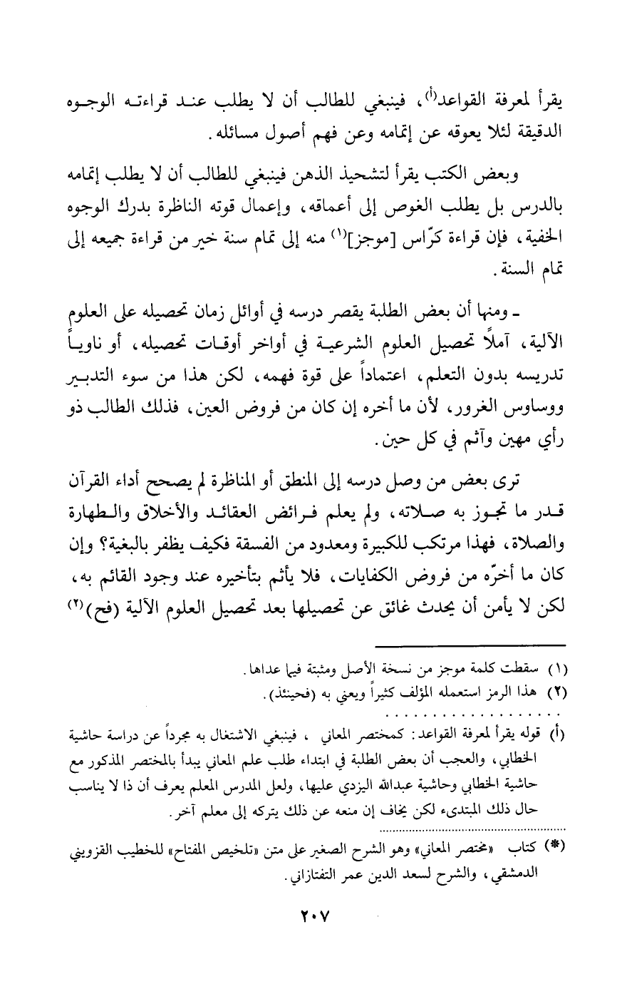 ترى بعض من وصل درسه إلي المنطق أو المناظرة لم يصحح أداء القرآن قدر ما تجوز به صلاته، ولم يعلم فرائض العقائد والأخلاق والطهارة والصلاة، فهذا مرتكب للكبيرة ومعدود من الفسقة فكيف يظفر بالبغية؟ وإن كان ما أخره من فروض الكفايات، فلا يأثم بتأخيره عند وجود القائم به، لكن لا يأمن أن يحدث غائق عن تحصيلها بعد تحصيل العلوم الآلية (فح).