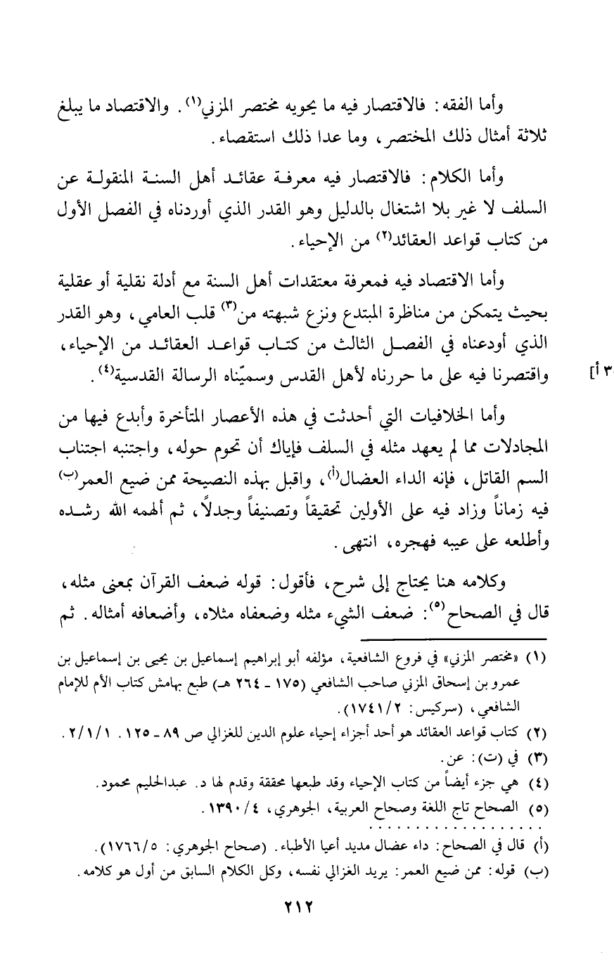وأما الاقتصاد فيه فمعرفة معتقدات أهل السنة مع أدلة نقلية أو عقلية بحيث يتمكن من مناظرة المبتدع ونزع شبهته من قلب العامي, وهو القدر الذي أودعناه في الفصل الثالث من كتاب قواعد العقائد من الإحياء واقتصرنا فيه على ما حررناه لأهل القدر وسمينّاه الرسالة القدسية.