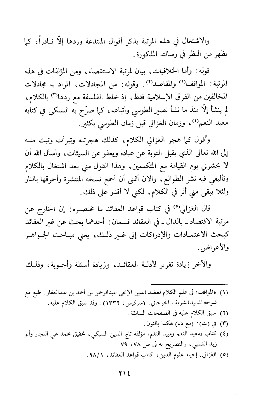 قال الغزالي: في كتاب قواعد العقائد ما مختصره/ إن الخارج عن مرتبة الاقتصاد-بالدال- في العقائد قسمان: أحدهما بحث من غير العقائد كبحث الاعتمادات والإدراكات إلى غير ذلك, يعني مباحث الجواهر والأعراض.