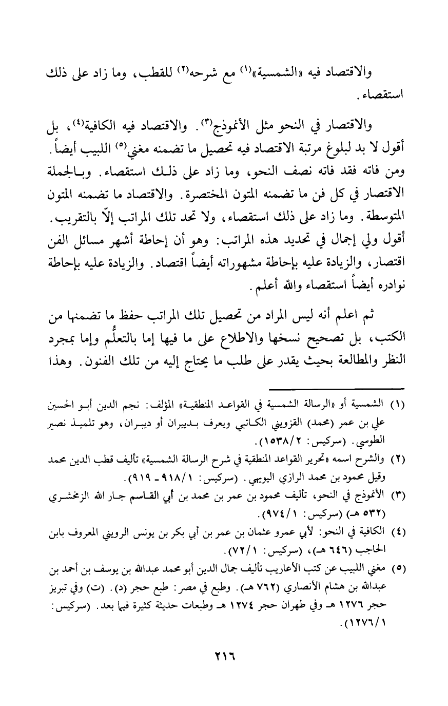 والاقتصار في النحو مثل الأنموذج. والاقتصاد فيه الكافية, بل أقول لابد لبلوغ مرتبة الاقتصاد فيه تحصيل ما تضمنه مغني اللبيب أيضًا.
