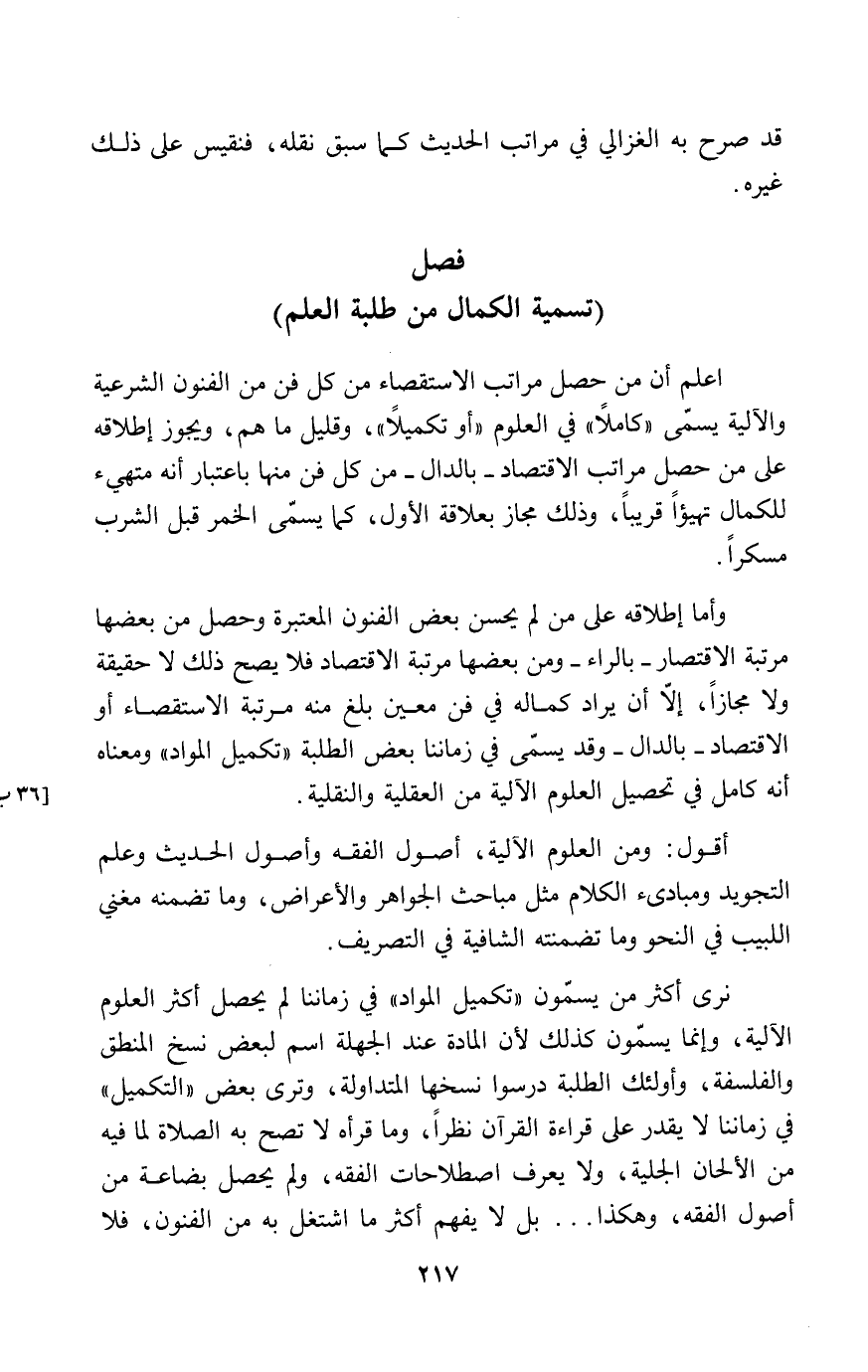 وأما إطلاقه على من لم يحسن بعض الفنون المعتبرة وحصل من بعضها مرتبة الاقتصار - بالراء- ومن بعضها مرتبة الاقتصاد فلا يصح ذلك لا حقيقة ولا مجازاً, إلاّ أن يراد كماله في فن معين بلغ منه مرتبة الاستقصاء أو الاقتصاد - بالدال - وقد يسمى في زماننا بعض الطلبة "تكميل المواد" ومعناه أنه كامل في تحصيل العلوم الآلية من العقلية والنقلية.