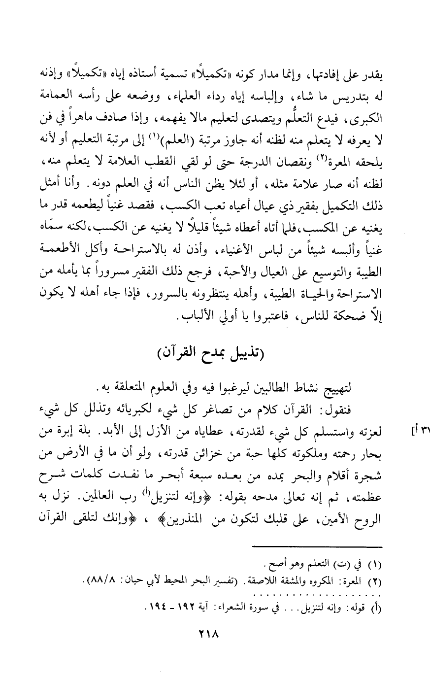 يقدر على إفادتها, وإنما مدار كونه "تكميلاً" تسمية أستاذه إياه "تكميلاً" وإذنه له بتدريس ما شاء, وإلباسه إياه رداء العلماء, ووضعه على رأسه العمامة الكبرى, فيدع التعلُّم ويتصدى لتعليم ما لا يفهمه, وإذا صادف ماهراً في فن لا يعرفه لا يتعلم منه لظنه أنه جاوز مرتبة (العلم) إلى مرتبة التعليم أو لأنه يلحقه المعرة, ونقصان الدرجة حتى لو لقي القطب العلامة لا يتعلم منه, لظنه أنه صار علامة مثله, أو لئلا يظن الناس أنه في العلم دونه. وأنا أمثل ذلك التكميل بفقير ذي عيال أعياه تعب الكسب, فقصد غنياً ليطعمه قدر ما يغنيه عن المكسب, فلما أتاه أعطاه شيئًا قليلاً لا يغنيه عن الكسب, لكنه سماه غنياً وألبسه شيئاً من لباس الأغنياء, وأذن له بالاستراحة وأكل الأطعمة الطيبة والتوسيع على العيال والأحبة, فرجع ذلك الفقير مسروراً بما يأمله من الاستراحة والحياة الطيبة, وأهله ينتظرونه بالسرور, فإذا جاء أهله لا يكون إلا ضحكة للناس, فاعتبروا يا أولي الألباب.