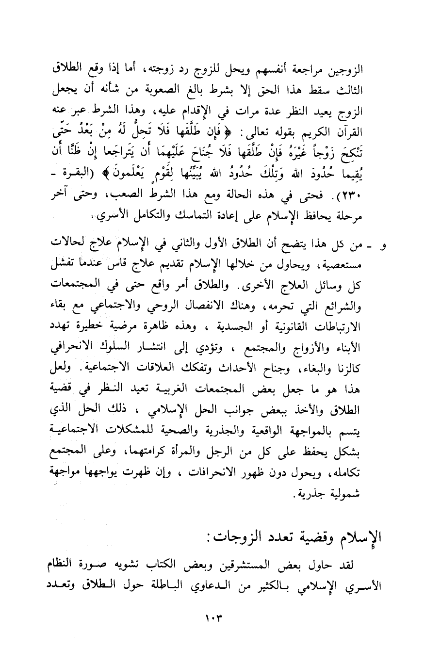 الزوجين مراجعة أنفسهما للزوج ردّ زوجته، أما إذا وقع الطلاق الثالث سقط هذا الحق إلا بشرط بالغ الصعوبة من شأنه أن يجعل الزوج يعيد النظر عدة مرات في الإقدام عليه، هذا الشرط عبر عنه القرآن الكريم بقوله تعالى: {فَإِنْ طَلَّقَهَا فَلا تَحِلُّ لَهُ مِنْ بَعْدُ حَتَّى تَنكِحَ زَوْجاً غَيْرَهُ فَإِنْ طَلَّقَهَا فَلا جُنَاحَ عَلَيْهِمَا أَنْ يَتَرَاجَعَا إِنْ ظَنَّا أَنْ يُقِيمَا حُدُودَ اللَّهِ وَتِلْكَ حُدُودُ اللَّهِ يُبَيِّنُهَا لِقَوْمٍ يَعْلَمُونَ} [البقرة: 230] . فحتَّى فِي هذه الحالة ومع هذا الشرط الصعب، وحتى آخر مرحلة يحافظ الإسلام على إعادة التماسك والتكامل الأسري.
