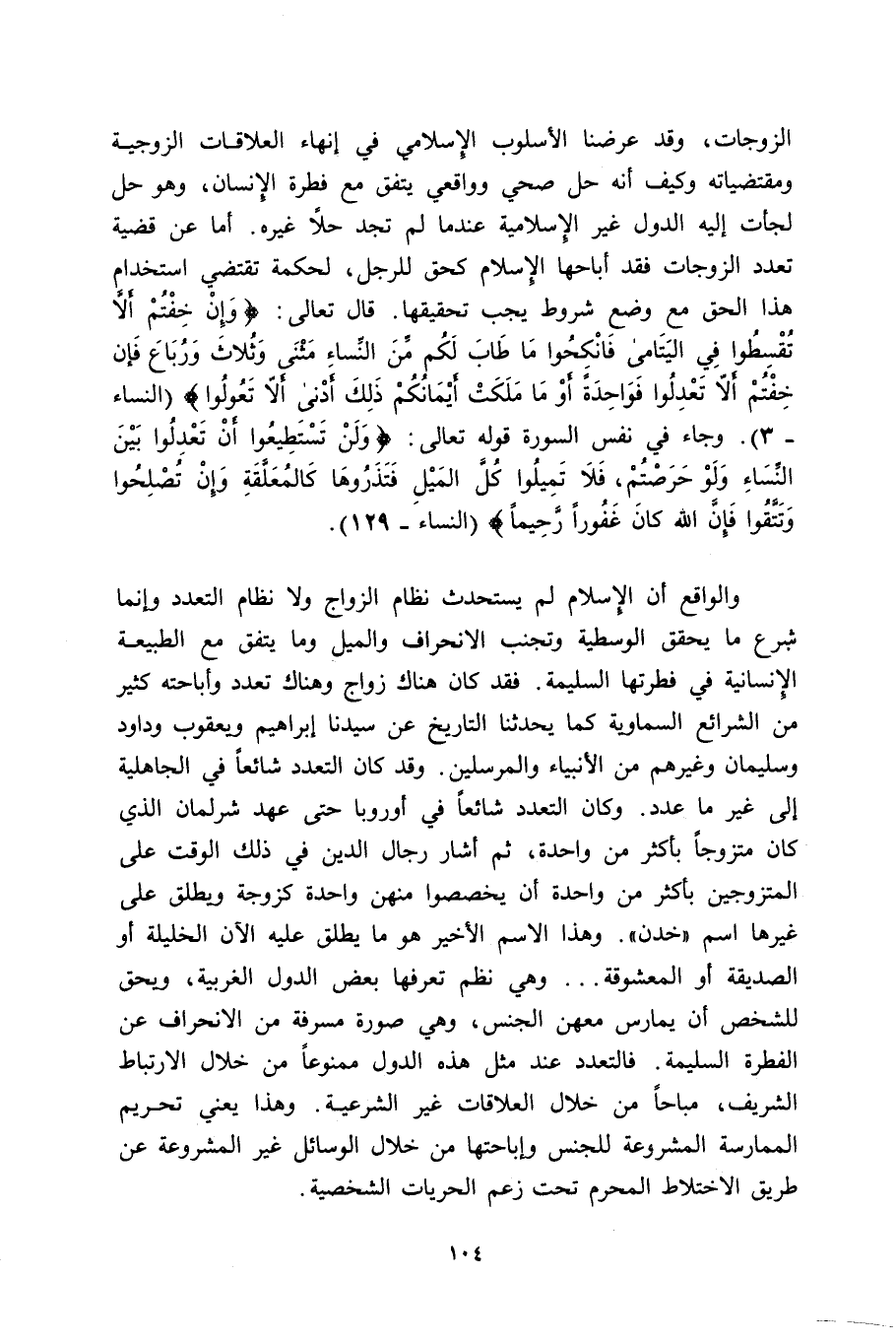 الزوجات، وقد عرضنا الأسلوب الإسلامي في إنهاء العلاقات الزوجية ومقتضياته وكيف أنه حل صحي وواقعي يتفق مع فطرة الإنسان، وهو حل لجَأَتْ إليه الدول غير الإسلامية عندما لم تجد حلًّا غيره. أما عن قضية تعدد الزوجات فقد أباحها الإسلام كحق للرجل، لحكمة تقتضي استخدام هذا الحق مع وضع شروط يجب تحقيقها. قال تعالى: {وَإِنْ خِفْتُمْ أَلاَّ تُقْسِطُوا فِي الْيَتَامَى فَانكِحُوا مَا طَابَ لَكُمْ مِنَ النِّسَاءِ مَثْنَى وَثُلاثَ وَرُبَاعَ فَإِنْ خِفْتُمْ أَلاَّ تَعْدِلُوا فَوَاحِدَةً أَوْ مَا مَلَكَتْ أَيْمَانُكُمْ ذَلِكَ أَدْنَى أَلاَّ تَعُولُوا} [النساء: 3] . وجاء في نفس السورة قوله تعالى: {وَلَنْ تَسْتَطِيعُوا أَنْ تَعْدِلُوا بَيْنَ النِّسَاءِ وَلَوْ حَرَصْتُمْ فَلا تَمِيلُوا كُلَّ الْمَيْلِ فَتَذَرُوهَا كَالْمُعَلَّقَةِ وَإِنْ تُصْلِحُوا وَتَتَّقُوا فَإِنَّ اللَّهَ كَانَ غَفُورًا رَحِيمًا} [النساء: 129] .