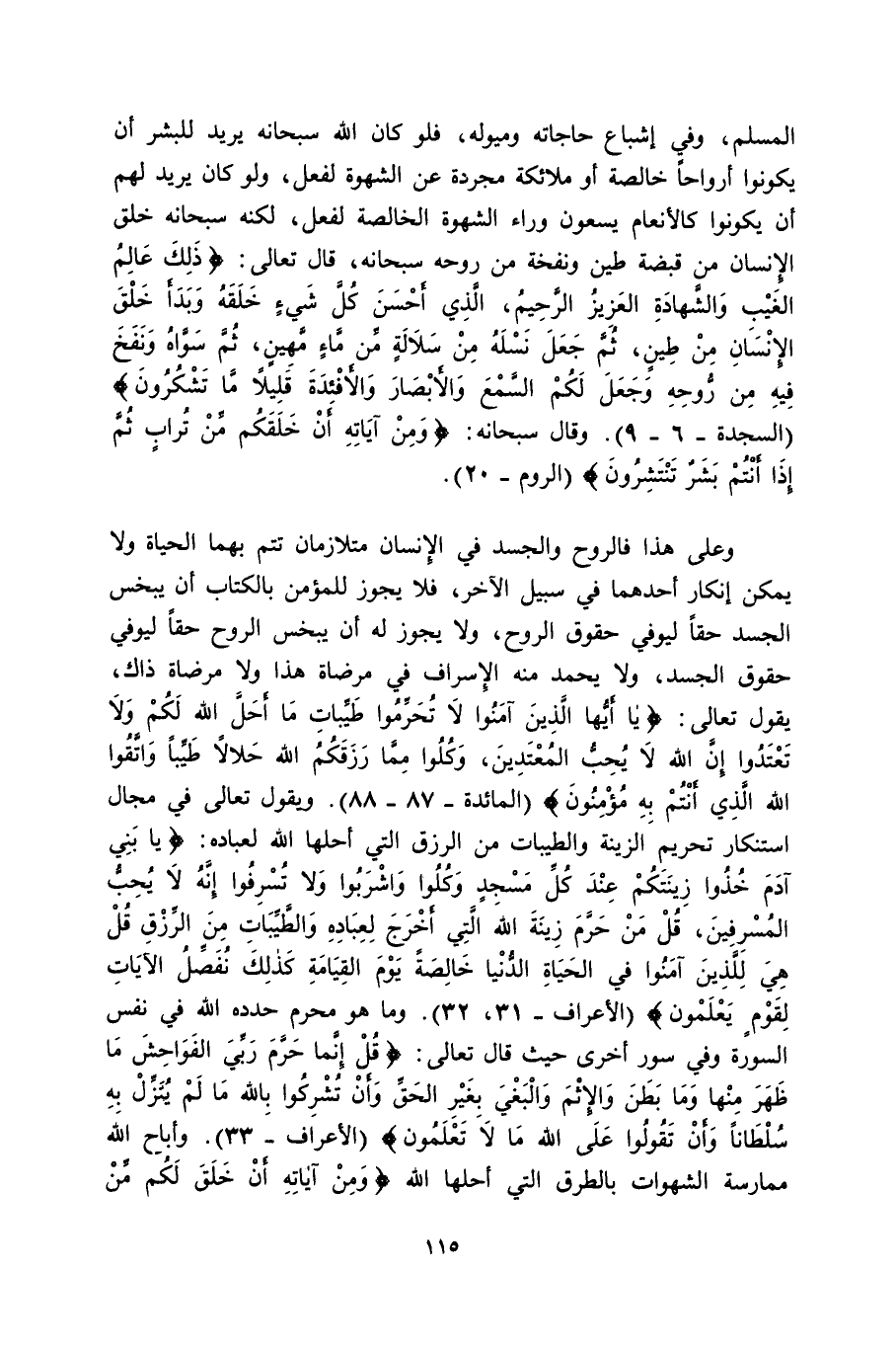 المسلم، وفي إشباع حاجاته وميوله، فلو كان الله سبحانه يريد للبشر أن يكونوا أرواحًا خالصة أو ملائكة مجردة عن الشهوة لفعل، ولو كان يريد لهم أن يكونوا كالأنعام يسعون وراء الشهوة الخالصة لفعل، لكنه سبحانه خلق الإنسان من قبضة طين ونفخة من روحه سبحانه، قال تعالى: {ذَلِكَ عَالِمُ الْغَيْبِ وَالشَّهَادَةِ الْعَزِيزُ الرَّحِيمُ، الَّذِي أَحْسَنَ كُلَّ شَيْءٍ خَلَقَهُ وَبَدَأَ خَلْقَ الإِنسَانِ مِنْ طِينٍ، ثُمَّ جَعَلَ نَسْلَهُ مِنْ سُلالَةٍ مِنْ مَاءٍ مَهِينٍ، ثُمَّ سَوَّاهُ وَنَفَخَ فِيهِ مِنْ رُوحِهِ وَجَعَلَ لَكُمُ السَّمْعَ وَالأَبْصَارَ وَالأَفْئِدَةَ قَلِيلًا مَا تَشْكُرُونَ} [السجدة: 6-9] . وقال سبحانه: {وَمِنْ آيَاتِهِ أَنْ خَلَقَكُمْ مِنْ تُرَابٍ ثُمَّ إِذَا أَنْتُمْ بَشَرٌ تَنتَشِرُونَ} [الروم: 20] .