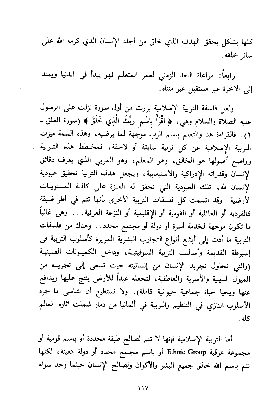 أما التربية الإسلامية فإنها لا تتم لصالح طبقة محددة أو باسم قومية أو مجموعة عرقية Ethnic Group أو باسم مجتمع محدد أو دولة معينة، لكنها تتم باسم الله خالق البشر والأكوان ولصالح الإنسان حيثما وجد سواء