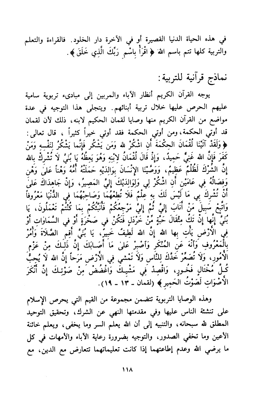 يوجه القرآن الكريم أنظار الآباء والمربين إلى مبادئ تربوية سامية عليهم الحرص عليها خلال تربية أبنائهم. ويتجلَّى هذا التوجيه فى عدة مواضع من القرآن الكريم منها لقمان الحكيم لابْنِهِ، ذلك لأن لقمان قد أوتي الحكمة، ومن أوتي الحكمة فقد أوتي خيرًا كثيرًا، قال تعالى: {وَلَقَدْ آتَيْنَا لُقْمَانَ الْحِكْمَةَ أَنِ اشْكُرْ لِلَّهِ وَمَنْ يَشْكُرْ فَإِنَّمَا يَشْكُرُ لِنَفْسِهِ وَمَنْ كَفَرَ فَإِنَّ اللَّهَ غَنِيٌّ حَمِيدٌ، وَإِذْ قَالَ لُقْمَانُ لابْنِهِ وَهُوَ يَعِظُهُ يَا بُنَيَّ لا تُشْرِكْ بِاللَّهِ إِنَّ الشِّرْكَ لَظُلْمٌ عَظِيمٌ، وَوَصَّيْنَا الإِنسَانَ بِوَالِدَيْهِ حَمَلَتْهُ أُمُّهُ وَهْنًا عَلَى وَهْنٍ وَفِصَالُهُ فِي عَامَيْنِ أَنِ اشْكُرْ لِي وَلِوَالِدَيْكَ إِلَيَّ الْمَصِيرُ، وَإِنْ جَاهَدَاكَ عَلى أَنْ تُشْرِكَ بِي مَا لَيْسَ لَكَ بِهِ عِلْمٌ فَلا تُطِعْهُمَا وَصَاحِبْهُمَا فِي الدُّنْيَا مَعْرُوفًا وَاتَّبِعْ سَبِيلَ مَنْ أَنَابَ إِلَيَّ ثُمَّ إِلَيَّ مَرْجِعُكُمْ فَأُنَبِّئُكُمْ بِمَا كُنتُمْ تَعْمَلُونَ، يَا بُنَيَّ إِنَّهَا إِنْ تَكُ مِثْقَالَ حَبَّةٍ مِنْ خَرْدَلٍ فَتَكُنْ فِي صَخْرَةٍ أَوْ فِي السَّمَوَاتِ أَوْ فِي الأَرْضِ يَأْتِ بِهَا اللَّهُ إِنَّ اللَّهَ لَطِيفٌ خَبِيرٌ، يَا بُنَيَّ أَقِمْ الصَّلاةَ وَأْمُرْ بِالْمَعْرُوفِ وَانْهَ عَنِ الْمُنكَرِ وَاصْبِرْ عَلَى مَا أَصَابَكَ إِنَّ ذَلِكَ مِنْ عَزْمِ الأُمُور، وَلا تُصَعِّرْ خَدَّكَ لِلنَّاسِ وَلا تَمْشِ فِي الأَرْضِ مَرَحًا إِنَّ اللَّهَ لا يُحِبُّ كُلَّ مُخْتَالٍ فَخُورٍ، وَاقْصِدْ فِي مَشْيِكَ وَاغْضُضْ مِنْ صَوْتِكَ إِنَّ أَنكَرَ الأَصْوَاتِ لَصَوْتُ الْحَمِيرِ} [لقمان: 13-19] .