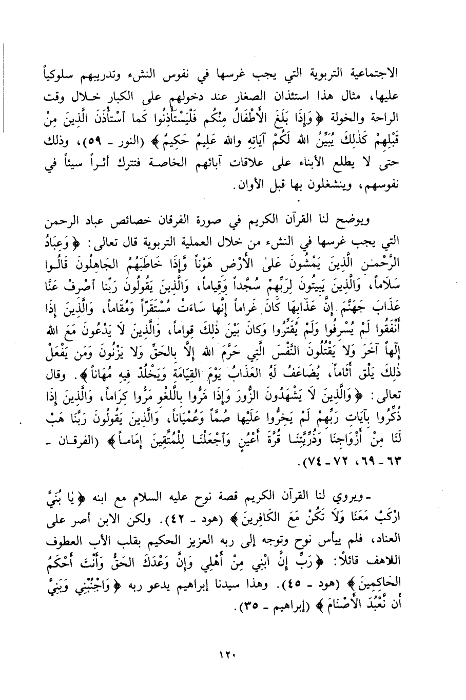 ويوضح لنا القرآن الكريم في سورة الفرقان خصائص عباد الرحمن التي يجب غرسها في النشء من خلال العملية التربوية قال تعالى: {وَعِبَادُ الرَّحْمَنِ الَّذِينَ يَمْشُونَ عَلَى الأَرْضِ هَوْنًا وَإِذَا خَاطَبَهُمُ الْجَاهِلُونَ قَالُوا سَلامًا، وَالَّذِينَ يَبِيتُونَ لِرَبِّهِمْ سُجَّداً وَقِيَاماً، وَالَّذِينَ يَقُولُونَ رَبَّنَا اصْرِفْ عَنَّا عَذَابَ جَهَنَّمَ إِنَّ عَذَابَهَا كَانَ غَرَاماً، إِنَّهَا سَاءَتْ مُسْتَقَرّاً وَمُقَاماً، وَالَّذِينَ إِذَا أَنفَقُوا لَمْ يُسْرِفُوا وَلَمْ يَقْتُرُوا وَكَانَ بَيْنَ ذَلِكَ قَوَاماً، وَالَّذِينَ لا يَدْعُونَ مَعَ اللَّهِ إِلَهاً آخَرَ وَلا يَقْتُلُونَ النَّفْسَ الَّتِي حَرَّمَ اللَّهُ إِلاَّ بِالْحَقِّ وَلا يَزْنُونَ وَمَنْ يَفْعَلْ ذَلِكَ يَلْقَ أَثَاماً، يُضَاعَفْ لَهُ الْعَذَابُ يَوْمَ الْقِيَامَةِ وَيَخْلُدْ فِيهِ مُهَانًا} [الفرقان: 63-96] . وقال تعالى: {وَالَّذِينَ لا يَشْهَدُونَ الزُّورَ وَإِذَا مَرُّوا بِاللَّغْوِ مَرُّوا كِرَامًا، وَالَّذِينَ إِذَا ذُكِّرُوا بِآيَاتِ رَبِّهِمْ لَمْ يَخِرُّوا عَلَيْهَا صُمّاً وَعُمْيَانًا، وَالَّذِينَ يَقُولُونَ رَبَّنَا هَبْ لَنَا مِنْ أَزْوَاجِنَا وَذُرِّيَّاتِنَا قُرَّةَ أَعْيُنٍ وَاجْعَلْنَا لِلْمُتَّقِينَ إِمَامًا} [الفرقان: 63-74] .