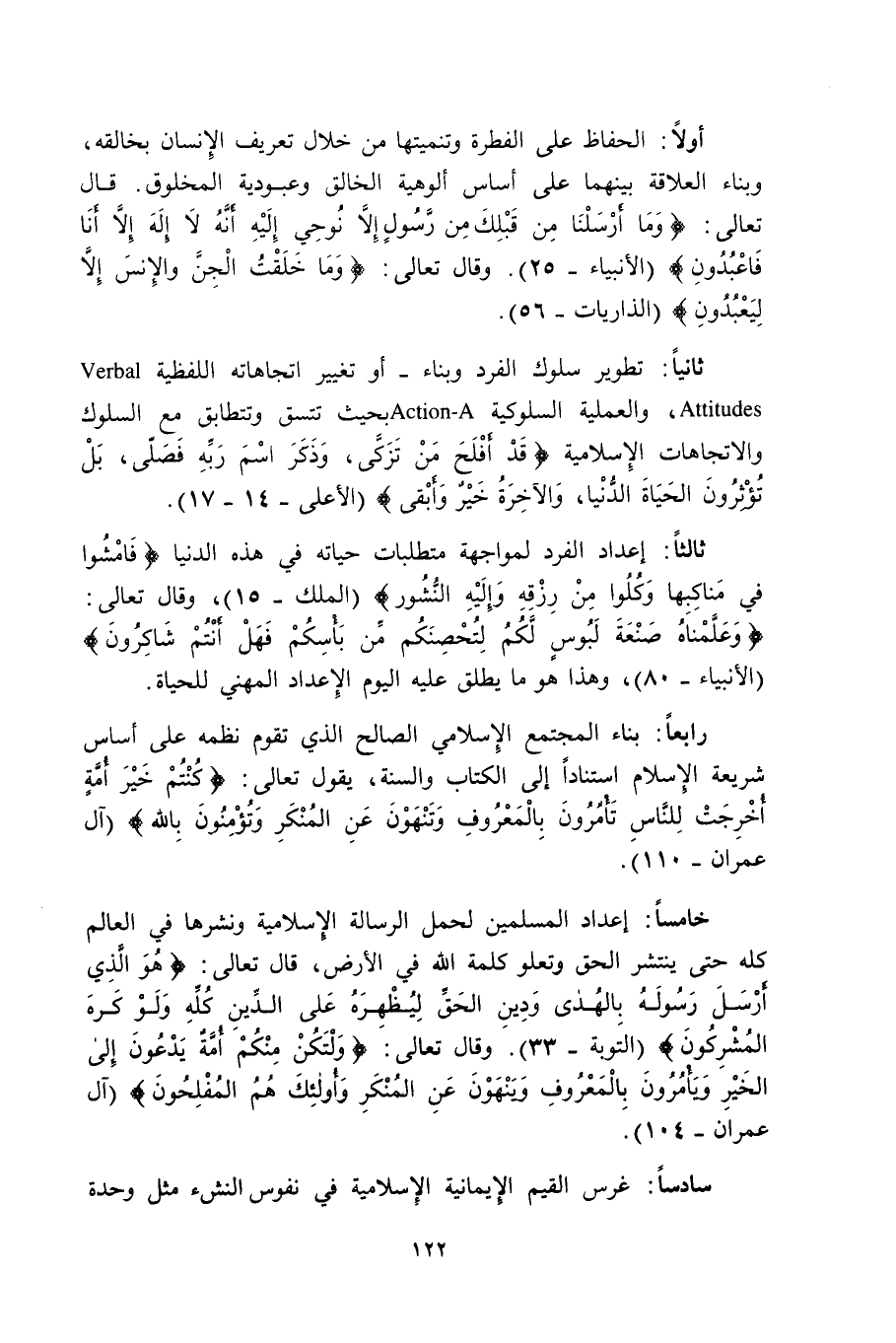 ثانيًا: تطوير سلوك الفرد وبناء -أو تغيير اتجاهاته اللفظية Verbal Atitudes والعملية السلوكية Action-A بحيث تتسق وتتطابق مع السلوك والاتجاهات الإسلامية {قَدْ أَفْلَحَ مَنْ تَزَكَّى، وَذَكَرَ اسْمَ رَبِّهِ فَصَلَّى، بَلْ تُؤْثِرُونَ الْحَيَاةَ الدُّنْيَا، وَالآخِرَةُ خَيْرٌ وَأَبْقَى} [الأعلي: 14-17] .