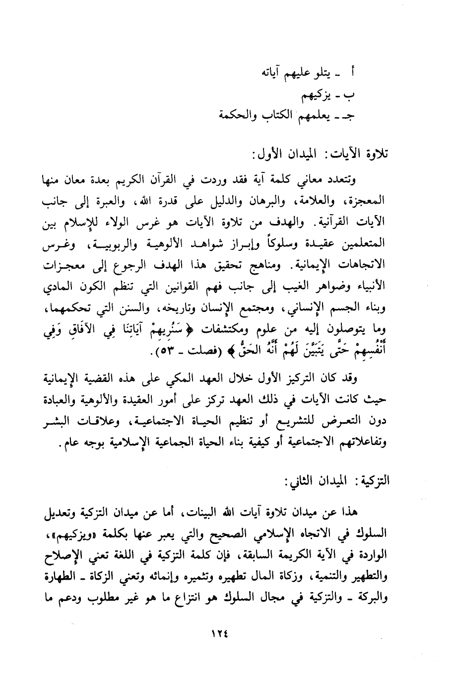 هذا عن ميدان تلاوة آيات الله البينات، أما عن ميدان التزكية وتعديل السلوك في الاتجاه الإسلامي الصحيح والتي يعبر عنها بكلمة "ويزكيهم" الواردة في الآية الكريمة السابقة، فإن كلمة التزكية في اللغة تعني الإصلاح والتطهير والتنمية، وزكاة المال تطهيره وتثميره وإنماؤه وتعني الزكاة -الطهارة والبركة- والتزكية في مجال السلوك هو انتزاع ما هو غير مطلوب ودعم ما
