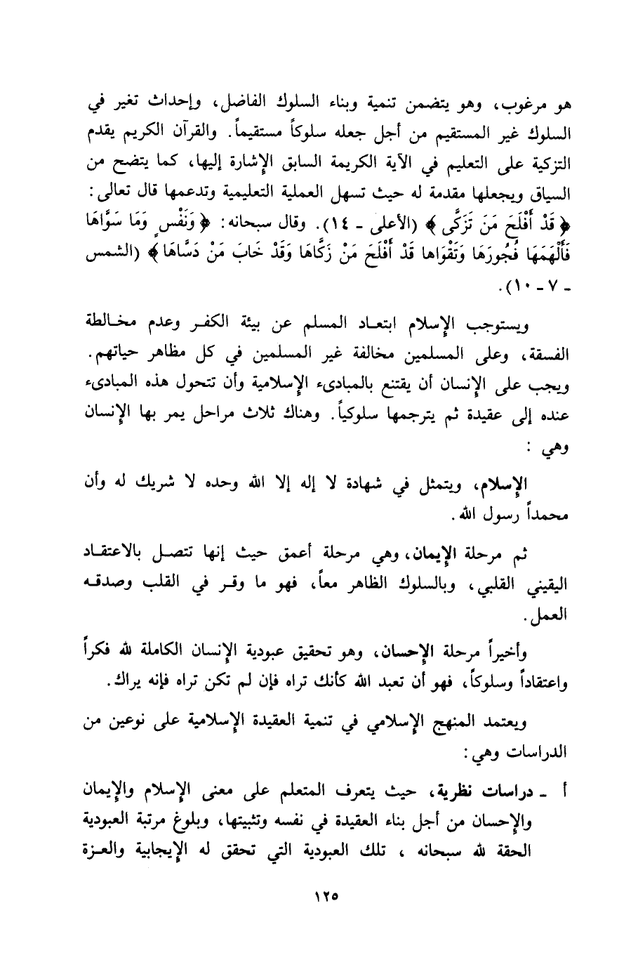 أ- دراسات نظرية، حيث يتعرف المتعلم على معنى الإسلام والإيمان والإحسان من أجل بناء العقيدة في نفسه وتثبيتها، وبلوغ مرتبة العبودية الحقة لله سبحانه، تلك العبودية التي تحقق له الإيجابية والعزة