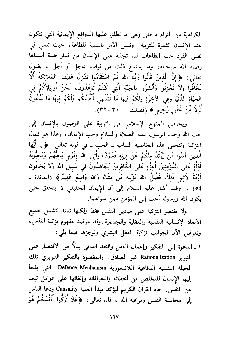 1- الدعوة إلى التفكير وإعمال العقل والنقد الذاتي بدلًا من الاقتصار على التبرير Rationalization غير الصادق. والمقصود بالتفكير التبريري تلك الحيلة النفسية اللاشعورية Defence Mechanism التي يلجأ إليها الإنسان للتخلص من أخطائه وانحرافاته وإلقائها على عوامل تبعد عن النفس. جاء القرآن الكريم ليؤكد مبدأ العلية Causality ودعا الناس إلى محاسبة النفس ومراقبة الله، قال تعالى: {فَلا تُزَكُّوا أَنفُسَكُمْ هُو