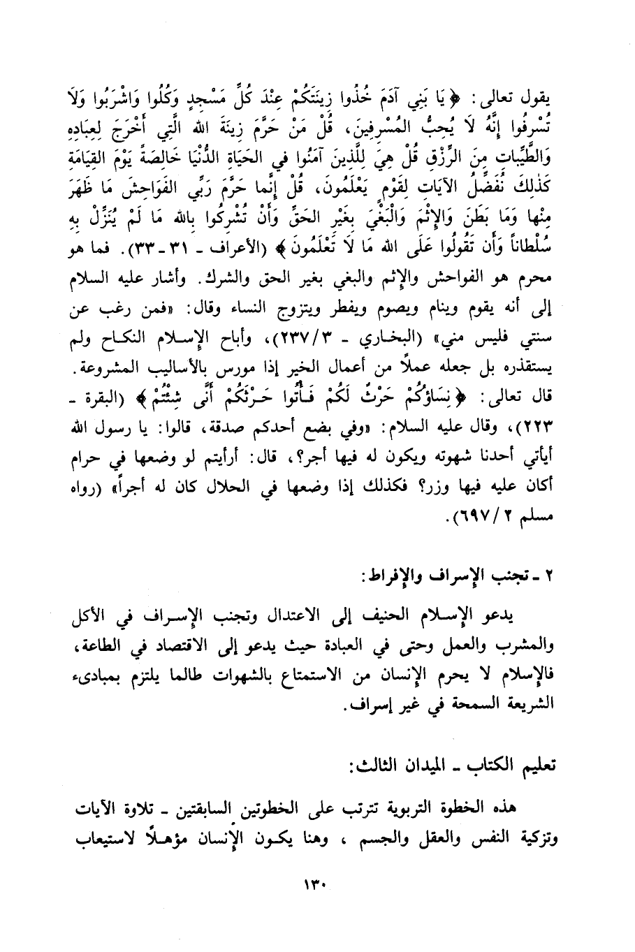يقول تعالى: {يَا بَنِي آدَمَ خُذُوا زِينَتَكُمْ عِنْدَ كُلِّ مَسْجِدٍ وَكُلُوا وَاشْرَبُوا وَلا تُسْرِفُوا إِنَّهُ لا يُحِبُّ الْمُسْرِفِينَ، قُلْ مَنْ حَرَّمَ زِينَةَ اللَّهِ الَّتِي أَخْرَجَ لِعِبَادِهِ وَالطَّيِّبَاتِ مِنَ الرِّزْقِ قُلْ هِيَ لِلَّذِينَ آمَنُوا فِي الْحَيَاةِ الدُّنْيَا خَالِصَةً يَوْمَ الْقِيَامَةِ كَذَلِكَ نُفَصِّلُ الآيَاتِ لِقَوْمٍ يَعْلَمُونَ، قُلْ إِنَّمَا حَرَّمَ رَبِّي الْفَوَاحِشَ مَا ظَهَرَ مِنْهَا وَمَا بَطَنَ وَالإِثْمَ وَالْبَغْيَ بِغَيْرِ الْحَقِّ وَأَنْ تُشْرِكُوا بِاللَّهِ مَا لَمْ يُنَزِّلْ بِهِ سُلْطَانًا وَأَنْ تَقُولُوا عَلَى اللَّهِ مَا لا تَعْلَمُونَ} [الأعراف: 31-33] . فما هو محرم هو الفواحش والإثم والبغي بغير الحق والشرك. وأشار عليه السلام إلى أنه يقوم وينام ويصوم ويفطر ويتزوج النساء وقال: "فمن رغب عن سنتي فليس مني" البخارى: 3/237، وأباح الإسلام النكاح ولم يستقذره بل جعله عملًا من أعمال الخير إذا مورس بالأساليب المشروعة. قال تعالى: {نِسَاؤُكُمْ حَرْثٌ لَكُمْ فَأْتُوا حَرْثَكُمْ أَنَّى شِئْتُم} [البقرة: 223] ، وقال عليه السلام: "وفي بضع أحدكم صدقة، قالوا: يا رسول الله أيأتي أحدنا شهوته ويكون له فيها أجر؟ قال: أرأيتم لو وضعها في حرام أكان عليه فيها وزر؟ فذلك إذا وضعها في الحلال كان له أجرًا" رواه مسلم: 2/697.
