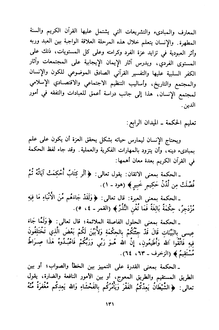 ويحتاج الإنسان ليمارس حياته بشكل يحقق العزة أن يكون على علم بمبادئ دينه، وأن يتزود بالمهارات الفكرية والعملية. وقد جاء لفظ الحكمة في القرآن الكريم بعدة معان أهمها: