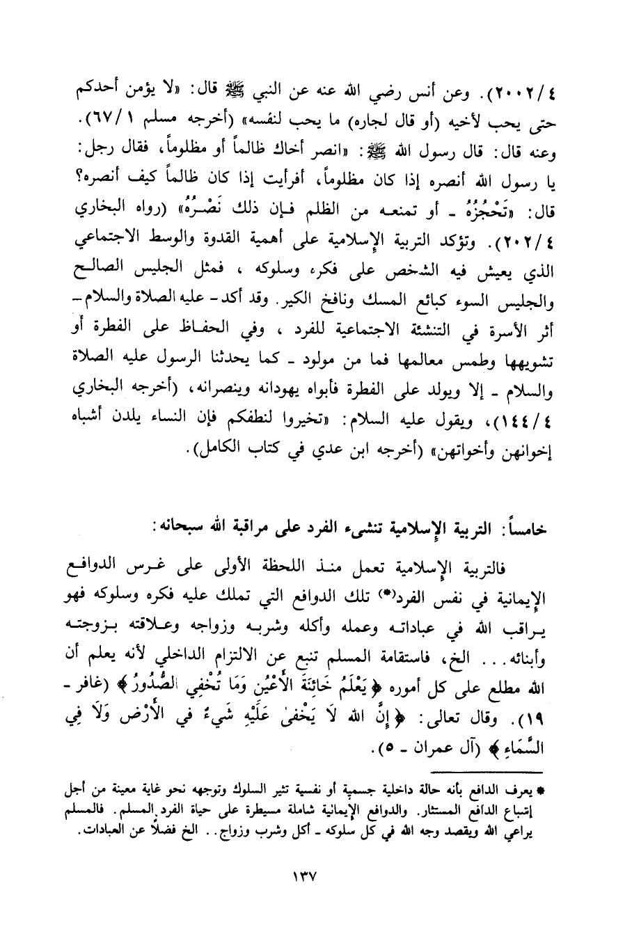 وعنه قال: قال رسول الله صلى الله عليه وسلم: "انصر أخاك ظالمًا أو مظلومًا فقال رجل: يا رسول الله أنصره إذا كان مظلومًا، أفرأيت إذا كان ظالمًا كيف أنصره؟ قال: تحجزه أو تمنعه من الظلم فإن ذلك نصره"، "رواه البخاري 4/ 202" وتؤكد التربية الإسلامية على أهمية القدوة والوسط الاجتماعي الذي يعيش فيه الشخص على فكره وسلوكه، فمثل الجليس الصالح والجليس السوء كبائع المسك ونافخ الكير، وقد أكد عليه الصلاة والسلام أثر الأسرة في التنشئة الاجتماعية للفرد، وفي الحفاظ على الفطرة أو تشويهها وطمس مصالحها فما من مولود كما يحدثنا الرسول صلى الله عليه وسلم: "إلا ويولد على الفطرة فأبواه يوهدانه أو ينصرانه"، "أخرجه البخاري 4/ 144" ويقول عليه السلام: "تخيروا لنطفكم فإن النساء يلدن أشباه إخوانهن وأخواتهن" "أخرجه ابن عدي في كتاب الكامل".