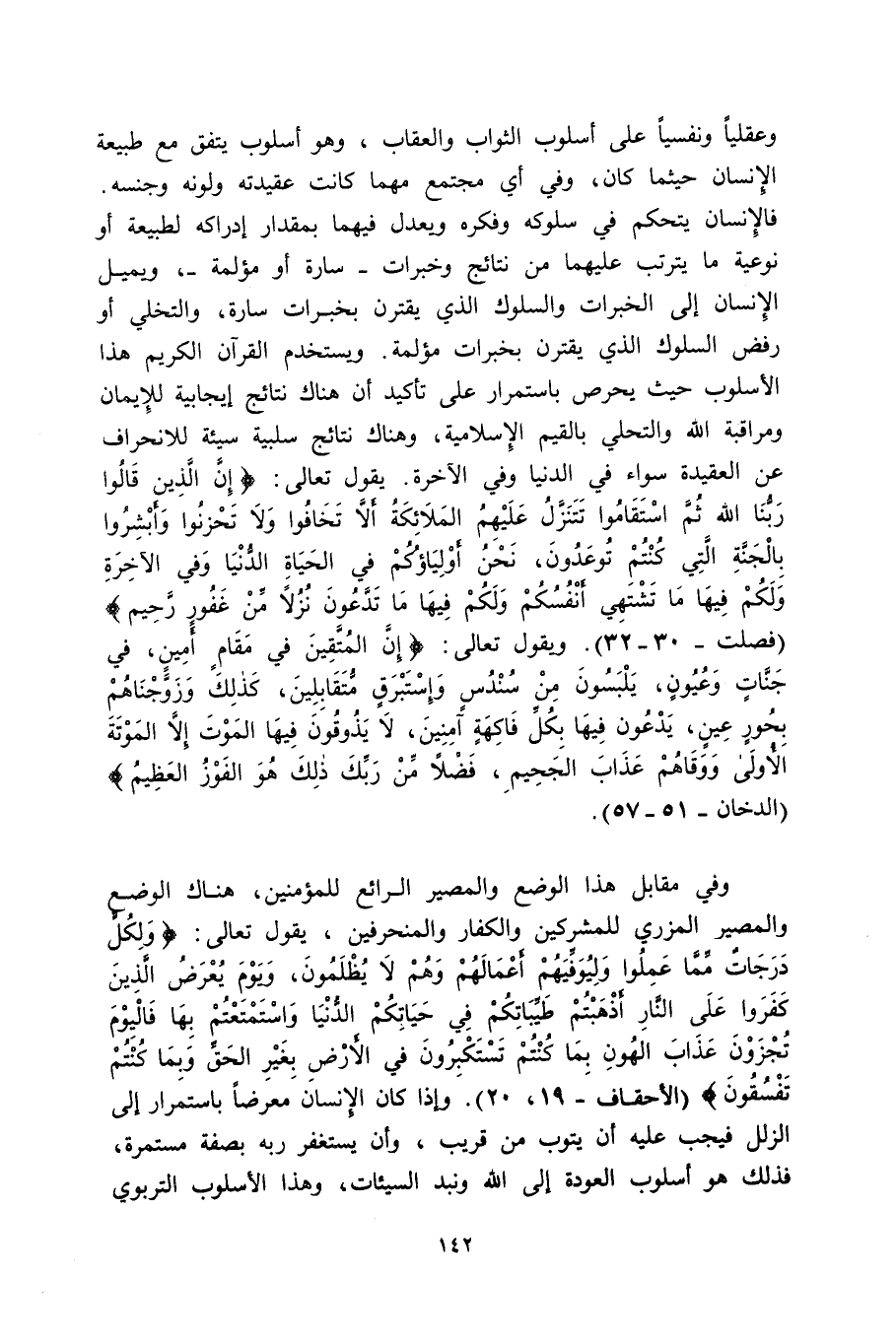وعقليًّا ونفسيًّا على أسلوب الثواب والعقاب، وهو أسلوب يتفق مع طبيعة الإنسان حيثما كان، وفي أي مجتمع مهما كانت عقيدته ولونه وجنسه. فالإنسان يتحكم في سلوكه وفكره ويعدل فيهما بمقدار إدراكه لطبيعة أو نوعية ما يترتب عليهما من نتائج وخبرات -سارَّة أو مؤلمة- ويميل الإنسان إلى الخبرات والسلوك الذي يقترن بخبرات سارة، والتخلي أو رفض السلوك الذي يقترن بخبرات مؤلمة. ويستخدم القرآن الكريم هذا الأسلوب حيث يحرص باستمرار على تأكيد أن هناك نتائج إيجابية للإيمان ومراقبة الله والتحلي بالقيم الإسلامية، وهناك نتائج سلبية سيئة للانحراف عن العقيدة سواء في الدنيا وفي الآخرة. يقول تعالى: {إِنَّ الَّذِينَ قَالُوا رَبُّنَا اللَّهُ ثُمَّ اسْتَقَامُوا تَتَنَزَّلُ عَلَيْهِمُ الْمَلائِكَةُ أَلاَّ تَخَافُوا وَلا تَحْزَنُوا وَأَبْشِرُوا بِالْجَنَّةِ الَّتِي كُنْتُمْ تُوعَدُونَ، نَحْنُ أَوْلِيَاؤُكُمْ فِي الْحَيَاةِ الدُّنْيَا وَفِي الآخِرَةِ وَلَكُمْ فِيهَا مَا تَشْتَهِي أَنفُسُكُمْ وَلَكُمْ فِيهَا مَا تَدَّعُونَ، نُزُلاً مِنْ غَفُورٍ رَحِيمٍ} [فصلت: 30-32] . ويقول تعالى: {إِنَّ الْمُتَّقِينَ فِي مَقَامٍ أَمِينٍ، فِي جَنَّاتٍ وَعُيُونٍ، يَلْبَسُونَ مِنْ سُندُسٍ وَإِسْتَبْرَقٍ مُتَقَابِلِينَ، كَذَلِكَ وَزَوَّجْنَاهُمْ بِحُورٍ عِينٍ، يَدْعُونَ فِيهَا بِكُلِّ فَاكِهَةٍ آمِنِينَ، لا يَذُوقُونَ فِيهَا الْمَوْتَ إِلاَّ الْمَوْتَةَ الأُولَى وَوَقَاهُمْ عَذَابَ الْجَحِيمِ، فَضْلاً مِنْ رَبِّكَ ذَلِكَ هُوَ الْفَوْزُ الْعَظِيمُ} [الدخان: 51-75] .
