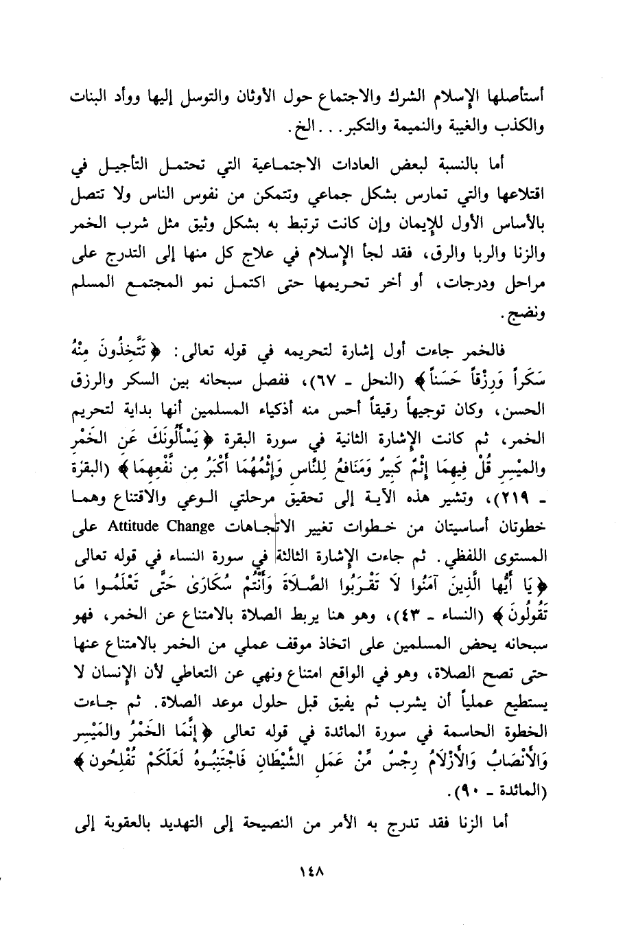 فالخمر جاءت أو إشارة لتحريمه في قوله تعالى: {تَتَّخِذُونَ مِنْهُ سَكَراً وَرِزْقاً حَسَناً} [النحل: 67] ففصل سبحانه بين السكر والرزق الحسن وكله توجيهًا رقيقًا أحس منه أذكياء المسلمين أنها بداية لتحريم الخمر، ثم كانت الإشارة الثانية في سورة البقرة: {يَسْأَلُونَكَ عَنِ الْخَمْرِ وَالْمَيْسِرِ قُلْ فِيهِمَا إِثْمٌ كَبِيرٌ وَمَنَافِعُ لِلنَّاسِ وَإِثْمُهُمَا أَكْبَرُ مِنْ نَفْعِهِمَا وَيَسْأَلُونَكَ مَاذَا يُنفِقُونَ قُلِ الْعَفْوَ كَذَلِكَ يُبَيِّنُ اللَّهُ لَكُمُ الآيَاتِ لَعَلَّكُمْ تَتَفَكَّرُونَ} [البقرة: 219] وتشير هذه الآية إلى تحقيق مرحلتي الوعي والاقتناع، وهما خطوتان أساسيتان من خطوات تغيير الاتجاهات Attitude change على المستوى اللفظي، ثم جاءت الإشارة الثالثة في سورة النساء في قوله تعالى: {يَا أَيُّهَا الَّذِينَ آمَنُوا لا تَقْرَبُوا الصَّلاةَ وَأَنْتُمْ سُكَارَى حَتَّى تَعْلَمُوا مَا تَقُولُونَ} [النساء:43] وهو هنا يربط الصلاة بالامتناع عن الخمر، فهو سبحانه يحض المسلمين على اتخاذ موقف عملي من الخمر بالامتناع عنها حتى تصح الصلاة، وهو في الواقع امتناع ونهي عن التعاطي؛ لأن الإنسان لا يستطيع عمليًّا أن يشرب ثم يفيق قبل حلول موعد الصلاة، ثم جاءت الخطوة الحاسمة في سورة المائدة في قوله تعالى: {إِنَّمَا الْخَمْرُ وَالْمَيْسِرُ وَالأَنصَابُ وَالأَزْلامُ رِجْسٌ مِنْ عَمَلِ الشَّيْطَانِ فَاجْتَنِبُوهُ لَعَلَّكُمْ تُفْلِحُونَ} [المائدة:90]