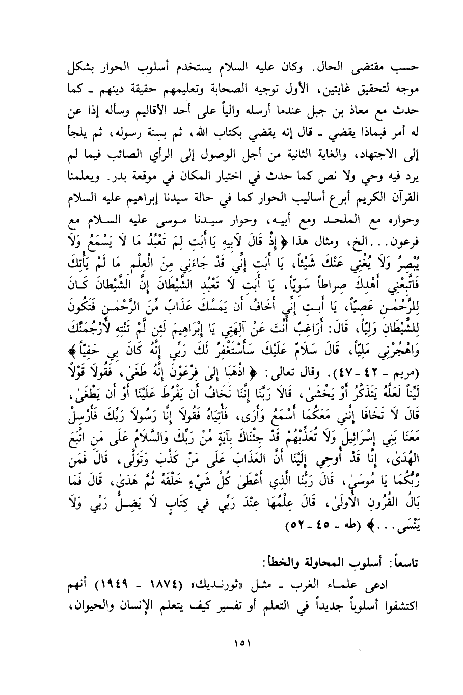 حسب مقتضى الحال. وكان عليه السلام يستخد أسلوب الحوار موجه لتحقيق غايتين، الأول: توجيه الصحابة وتعليمهم حقيقة دينهم -كما حدث مع معاذ بن جبل عندما أرسله واليًا على أحد الأقاليم وسأله إذا عَنَّ له أمر فبماذا يقضى- قال إنه يقضي بكتاب الله، ثم بسنة رسوله، ثم يلجأ إلى الاجتهاد، والغاية الثانية: من أجل الوصول إلى الرأي الصائب فيما لم يرد فيه وحي ولا نص كما حدث في اختيار المكان في موقعه بدر. ويعلمنا القرآن الكريم أبرع أساليب الحوار كما في حالة سيدنا إبراهيم -عليه السلام- وحواره مع الملحد ومع أبيه، وحوار سيدنا موسي -عليه السلام- مع فرعون ... إلخ، ومثال هذا: {إِذْ قَالَ لأَبِيهِ يَا أَبَتِ لِمَ تَعْبُدُ مَا لا يَسْمَعُ وَلا يُبْصِرُ وَلا يُغْنِي عَنْكَ شَيْئاً، يَا أَبَتِ إِنِّي قَدْ جَاءَنِي مِنَ الْعِلْمِ مَا لَمْ يَأْتِكَ فَاتَّبِعْنِي أَهْدِكَ صِرَاطاً سَوِيًّا، يَا أَبَتِ لا تَعْبُدْ الشَّيْطَانَ إِنَّ الشَّيْطَانَ كَانَ لِلرَّحْمَنِ عَصِيًّا، يَا أَبَتِ إِنِّي أَخَافُ أَنْ يَمَسَّكَ عَذَابٌ مِنَ الرَّحْمَنِ فَتَكُونَ لِلشَّيْطَانِ وَلِيًّا، قَالَ أَرَاغِبٌ أَنْتَ عَنْ آلِهَتِي يَا إِبْراهِيمُ لَئِنْ لَمْ تَنتَهِ لأَرْجُمَنَّكَ وَاهْجُرْنِي مَلِيًّا، قَالَ سَلامٌ عَلَيْكَ سَأَسْتَغْفِرُ لَكَ رَبِّي إِنَّهُ كَانَ بِي حَفِيًّا} [مريم: 42-47] . وقال تعالى: {اذْهَبَا إِلَى فِرْعَوْنَ إِنَّهُ طَغَى، فَقُولا لَهُ قَوْلًا لَيِّنًا لَعَلَّهُ يَتَذَكَّرُ أَوْ يَخْشَى، قَالا رَبَّنَا إِنَّنَا نَخَافُ أَنْ يَفْرُطَ عَلَيْنَا أَوْ أَنْ يَطْغَى، قَالَ لا تَخَافَا إِنَّنِي مَعَكُمَا أَسْمَعُ وَأَرَى، فَأْتِيَاهُ فَقُولا إِنَّا رَسُولا رَبِّكَ فَأَرْسِلْ مَعَنَا بَنِي إِسْرَائِيلَ وَلا تُعَذِّبْهُمْ قَدْ جِئْنَاكَ بِآيَةٍ مِنْ رَبِّكَ وَالسَّلامُ عَلَى مَنِ اتَّبَعَ الْهُدَى، إِنَّا قَدْ أُوحِيَ إِلَيْنَا أَنَّ الْعَذَابَ عَلَى مَنْ كَذَّبَ وَتَوَلَّى، قَالَ فَمَنْ رَبُّكُمَا يَا مُوسَى، قَالَ رَبُّنَا الَّذِي أَعْطَى كُلَّ شَيْءٍ خَلْقَهُ ثُمَّ هَدَى، قَالَ فَمَا بَالُ الْقُرُونِ الأُولَى، قَالَ عِلْمُهَا عِنْدَ رَبِّي فِي كِتَابٍ لا يَضِلُّ رَبِّي وَلا يَنسَى} [طه: 43-52] .