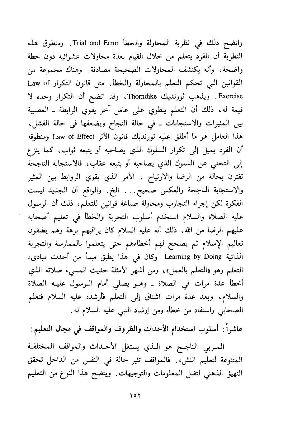 واتضح ذلك في نظرية المحاولة والخطأ tri and eirror، ومنطوق هذه النظرية أن الفرد يتعلم من خلال القيام بعدة محاولات عشوائية دون خطة واضحة، وأنه يكتشف المحاولات الصحيحة مصادفة، وهناك مجموعة من القوانين التي تحكم التعلم بالمحاولة، مثل قانون التكرار law off Exerise ويذهب ثورنديك thourdke وقد اتضح أن التكرار وحده لا قيمة له، ذلك أن التعلم ينطوي على عامل آخر يقوي الرابطة العصبية بين المثيرات، والاستجابات في حالة النجاح ويضعفها في حالة الفشل، هذا العامل هو مما أطلق عليه ثورنديك قانون الأثر law of effect ومنطوقه أن الفرد يميل إلى تكرار السلوك الذي يصاحبه أو يتبعه ثواب، كما ينزع إلى التخلي عن السلوك الذي يصاحبه أو يتبعه عقاب، فالاستجابة الناجحة تقترن بحالة من الرضا، الأمر الذي يقوي الروابط بين المثير والاستجابة الناجحة، والعكس صحيح ... إلخ، والواقع أن الجديد ليست الفكرة لكن إجراء التجارب ومحاولة صياغة قوانين التعلم، ذلك أن الرسول -عليه الصلاة والسلام- استخدم أسلوب التجربة والخطأ، في تعليم أصحابه عليهم الرضا من الله، ذلك أنه عليه السلام كان يراقبهم برهة وهم يطبقون الذاتية learning by doing وكان في هذا يطبق مبدأ من أحدث مبادئ التعلم وهو "التعلم بالعمل"، ومن أشهر الأمثلة حديث المسيء صلاته الذي أخطأ عدة مرات في الصلاة اشتاق إلى التعلم، فأرشده عليه السلام فتعلم الصحابي واستفاد من خطأه ومن إرشاد النبي -صلى الله عليه وسلم- له