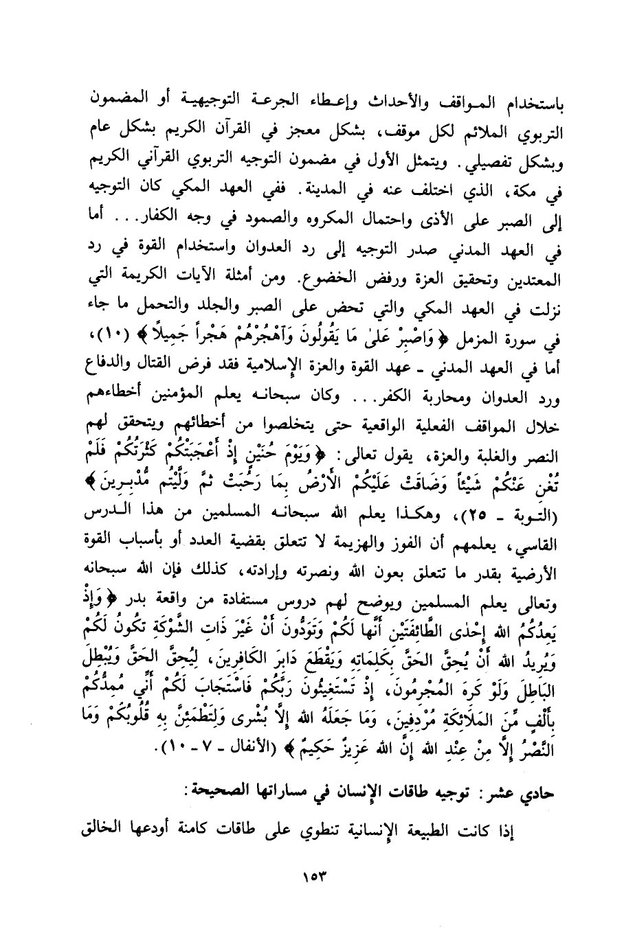 باستخدام المواقف وإعطاء الجرعة التوجيهية أو المضمون التربوي الملائم لكل موقف، بشكل معجز في القرآن الكريم بشكل عام وبشكل تفصيلي، ويتمثل الأول في مضمون التوجيه التربوي القرآن الكريم في مكة، الذي اختلف عنه في المدينة، ففي العهد المكي كان التوجيه إلى الصبر على الأذى واحتمال المكروه والصمود في وجه الكفار.. أما في العهد المدني صدر التوجيه إلى رد العدوان، واستخدام القوة في رد المعتدين وتحقيق العزة ورفض الخضوع، ومن أمثلة الآيات الكريمة التي نزلت في العهد المكي والتي تحض على الصبر والجلد والتحمل ما جاء في سورة المزمل: {وَاصْبِرْ عَلَى مَا يَقُولُونَ وَاهْجُرْهُمْ هَجْراً جَمِيلاً} [المزمل: 10] أما في العهد المدني عهد القوة والعزة الإسلامية فقد فرض القتال والدفاع ورد العدوان ومحاربة الكفر ... وكان سبحانه يعلم المؤمنين أخطاءهم خلال المواقف الفعلية الواقعية حتى يتخلصوا من أخطائهم، ويتحقق لهم النصر والغلبة والعزة، يقول تعالى: {وَيَوْمَ حُنَيْنٍ إِذْ أَعْجَبَتْكُمْ كَثْرَتُكُمْ فَلَمْ تُغْنِ عَنْكُمْ شَيْئاً وَضَاقَتْ عَلَيْكُمُ الأَرْضُ بِمَا رَحُبَتْ ثُمَّ وَلَّيْتُمْ مُدْبِرِينَ} [التوبة: 25] وهكذا يعلم الله سبحانه المسلمين من هذا الدرس القاسي، يعلمهم أن الفوز والهزيمة لا تتعلق بقضية العدد أو بأسباب القوة الأرضية بقدر ما تتعلق بعون الله ونصرته وإرادته، كذلك فإن الله سبحانه وتعالى يعلم المسلمين ويوضح لهم دروس مستفادة من واقعة بدر: {وَإِذْ يَعِدُكُمُ اللَّهُ إِحْدَى الطَّائِفَتَيْنِ أَنَّهَا لَكُمْ وَتَوَدُّونَ أَنَّ غَيْرَ ذَاتِ الشَّوْكَةِ تَكُونُ لَكُمْ وَيُرِيدُ اللَّهُ أَنْ يُحِقَّ الْحَقَّ بِكَلِمَاتِهِ وَيَقْطَعَ دَابِرَ الْكَافِرِينَ، لِيُحِقَّ الْحَقَّ وَيُبْطِلَ الْبَاطِلَ وَلَوْ كَرِهَ الْمُجْرِمُونَ، إِذْ تَسْتَغِيثُونَ رَبَّكُمْ فَاسْتَجَابَ لَكُمْ أَنِّي مُمِدُّكُمْ بِأَلْفٍ مِنَ الْمَلائِكَةِ مُرْدِفِينَ، وَمَا جَعَلَهُ اللَّهُ إِلاَّ بُشْرَى وَلِتَطْمَئِنَّ بِهِ قُلُوبُكُمْ وَمَا النَّصْرُ إِلاَّ مِنْ عِنْدِ اللَّهِ إِنَّ اللَّهَ عَزِيزٌ حَكِيمٌ} [الأنفال: 7-10] .