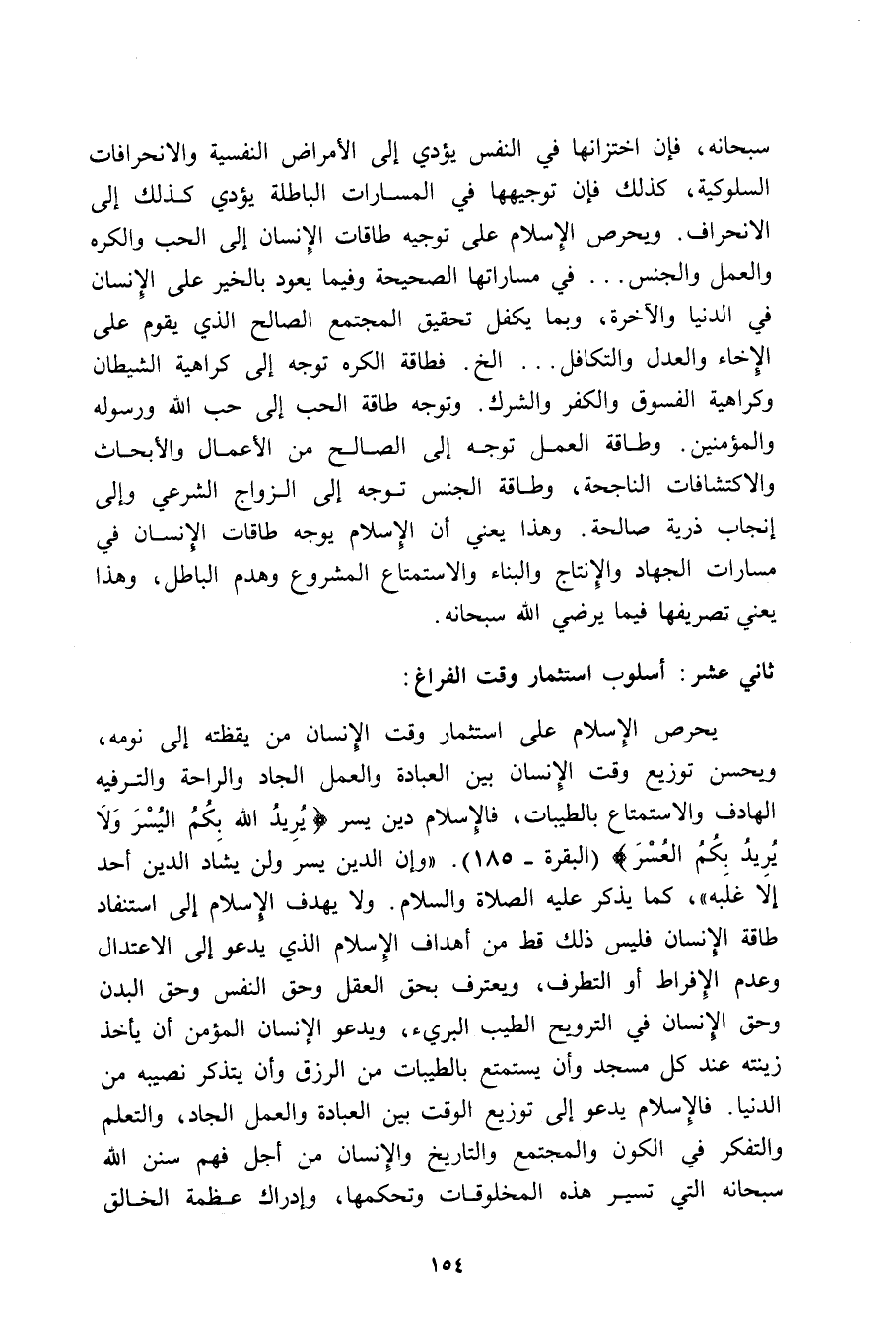 يحرص الإسلام على استثمار وقت الإنسان من يقظته إلى نومه، ويحسن توزيع وقت الإنسان بين العبادة والعمل الجاد والراحة والترفيه الهادف والاستمتاع بالطيبات، فالإسلام دين يسر {يُرِيدُ اللَّهُ بِكُمُ الْيُسْرَ وَلا يُرِيدُ بِكُمُ الْعُسْرَ} [البقرة: 185] . "وإن الدينَ يسرٌ ولن يشادَّ الدين أحد إلا غلبه"، كما يذكر عليه الصلاة والسلام. ولا يهدف الإسلام إلى استنفاد طاقة الإنسان فليس ذلك قطٌّ من أهداف الإسلام الذي يدعو إلى الاعتدال وعدم الإفراط أو التطرف، ويعترف بحق العقل وحق النفس وحق البدن وحق الإنسان في الترويح الطيب البريء، ويدعو الإنسان المؤمن أن يأخذ زِينَتَهُ عِنْدَ كُلِّ مَسْجِدٍ وأن يستمتع بالطيبات من الرزق وأن يتذكر نصيبه من الدنيا. فالإسلام يدعو إلى توزيع الوقت بين العبادة والعمل الجادّ، والتعليم والتفكير في الكون والمجتمع والتاريخ والإنسان من أجل فهم سنن الله سبحانه التي تسير هذه المخلوقات وتحكمها، وإدراك عظمة الخالق