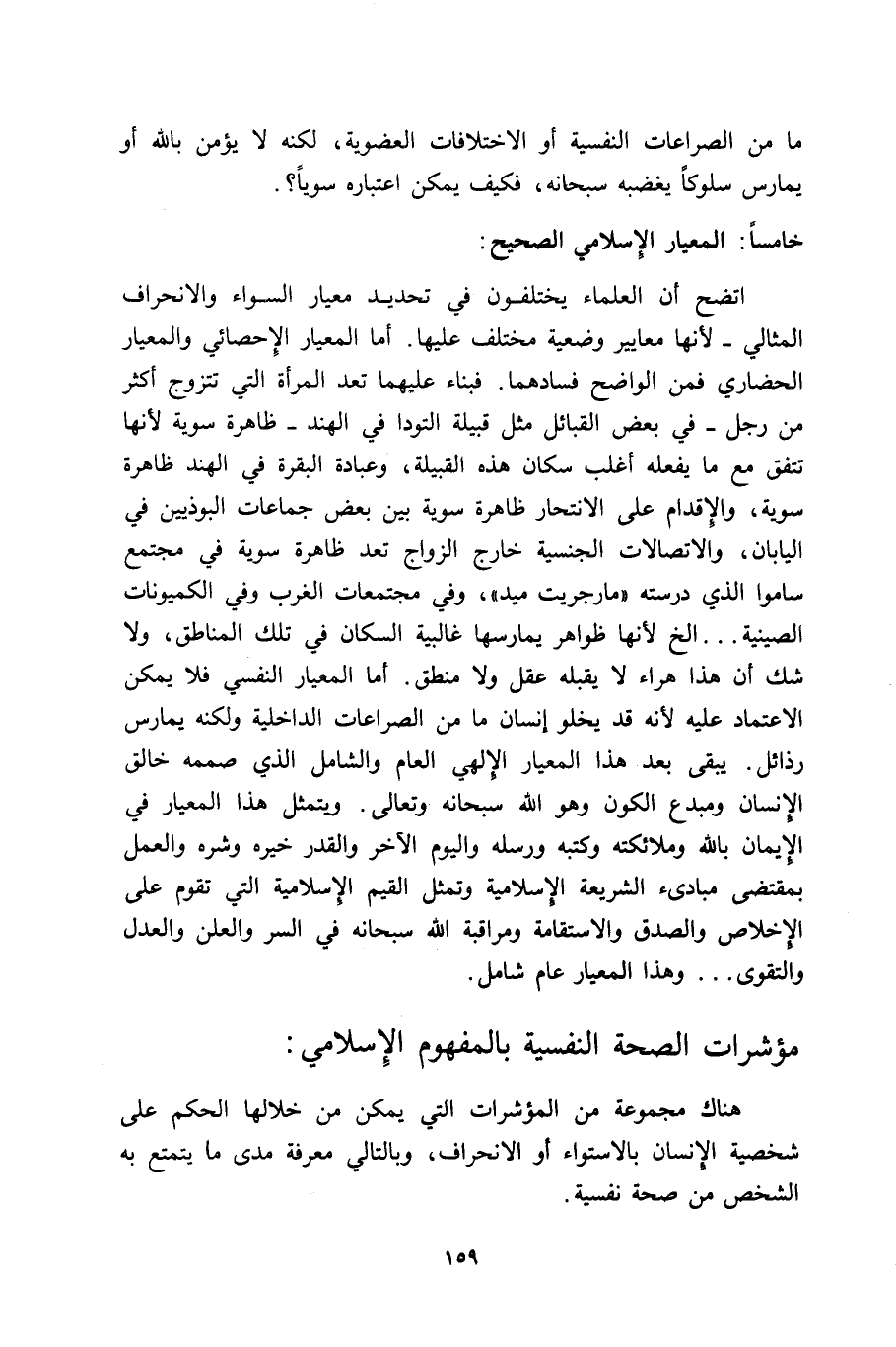 اتضح أن العلماء يختلفون في تحديد معيار السواء والانحراف المثالي -لأنها معايير وضعية مختلف عليها. أما المعيار الإحصائي والمعيار الحضاري فمن الواضح فسادهما. فبناء عليهما تعد المرأة التي تتزوج أكثر من رجل -في بعض القبائل مثل قبيلة التودا في الهند- ظاهرة سوية لأنها تتفق مع ما يفعله أغلب سكان هذه القبيلة، وعبادة البقرة في الهند ظاهرة سوية، والإقدام على الانتحار ظاهرة سوية بين بعض جماعات البوذيين في اليابان، والاتصالات الجنسية خارج الزواج تعد ظاهرة سويةً في مجتمع ساموا الذي درسته "مارجريت ميد"، وفي مجتمعات الغرب وفي الكميونات الصينية ... إلخ؛ لأنها ظواهر يمارسها غالبية السكان في تلك المناطق، ولا شك أن هذا هراء لا يقبله عقل ولا منطق. أما المعيار النفسي فلا يمكن الاعتماد عليه لأنه قد يخلو إنسان ما من الصراعات الداخلية ولكنه يمارس رذائل. يبقى بعد هذا المعيار الإلهي العام والشامل الذي صَمَّمَه خالق الإنسان ومبدع الكون وهو الله سبحانه وتعالى. ويتمثل هذا المعيار في الإيمان بالله وملائكته وكتبه ورسله واليوم الآخر والقدر خيره وشره والعمل بمقتضى مبادئ الشريعة الإسلامية وتمثل القيم الإسلامية التي تقوم على الإخلاص والصدق والاستقامة ومراقبة الله سبحانه في السر والعلن والعدل والتقوى ... وهذا المعيار عام شامل.